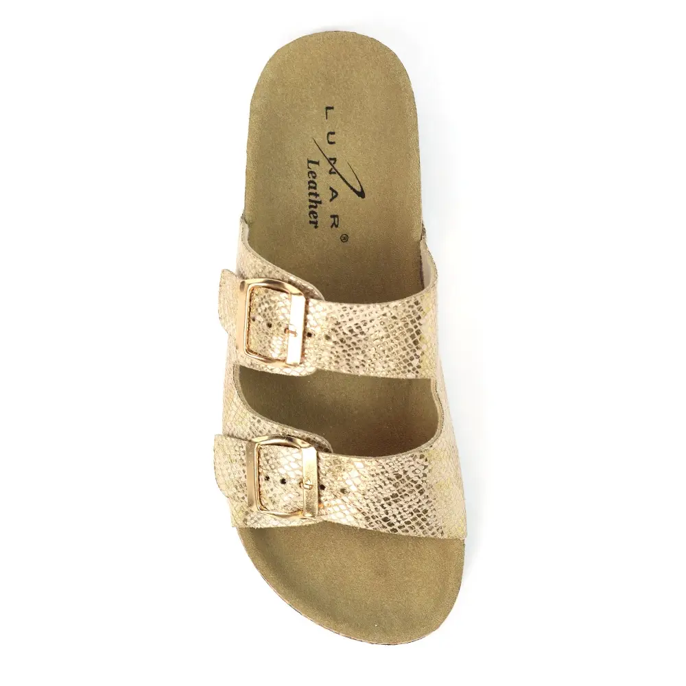 Meet Mykonos, a shiny new addition to the Lunar sandal collection. This slip-on style features a gold metallic snakeskin print upper, adding a hint of glamour to your ensembles. The suede insock and padded insole are designed to ensure day-long cushioning, so you can step out in style and comfort all summer long.