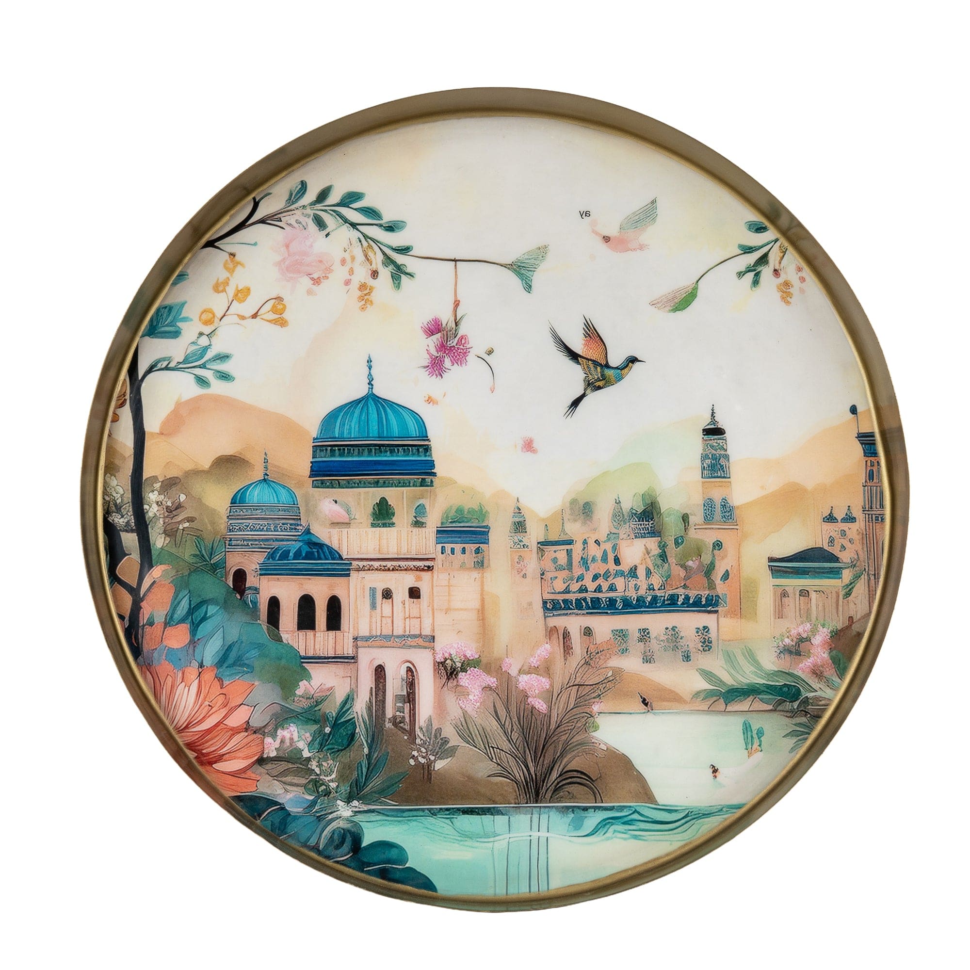 nvite a hint of far-flung elegance to your home with the Metal Tray from The Silk Road Collection – Jhangye, featuring a round silhouette with a satin-gold rim framing an enchanting scene of domed palaces, hummingbirds and painterly florals. Crafted from sturdy metal with a smooth, wipe-clean surface, it is as practical as it is beautiful: perfect for serving drinks, corralling keys and jewellery, or styling candles and diffusers on a coffee table, ottoman or console. The raised edge helps keep contents secure, while the richly detailed artwork brings colour and story to any setting.