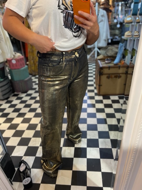Ramp up your looks this season with these metallic gold jeans! They sparkle so beautifully in the light and can be worn for party or casual looks! We are obsessed! These give such earth tones off and change and twinkle in the light.