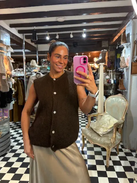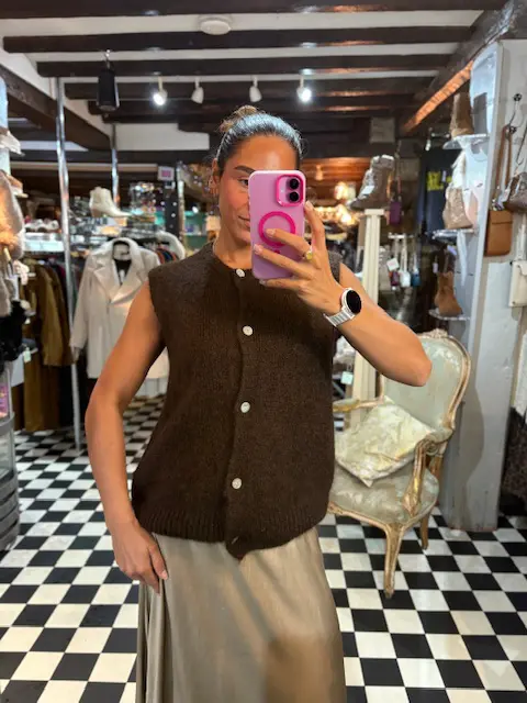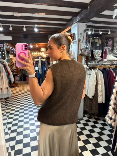 Beautiful chocolate brown knit mohair and wool blend waistcoat. Perfect for those autumn and winter looks. These can be layered on top of shirts, blouses, tops or just as is.