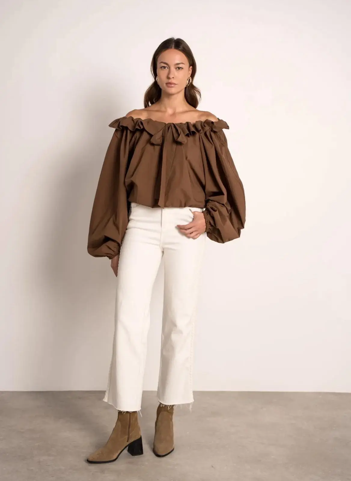 With a gathered/ruffled off the shoulder style neckline and balloon sleeve, this top oozes simple glamour. Made from 100% cotton, it’s built to last. It’s a the perfect chocolate brown colour that can be worn simply with jeans and flats or elevated with heels. Great for the up and coming party season!