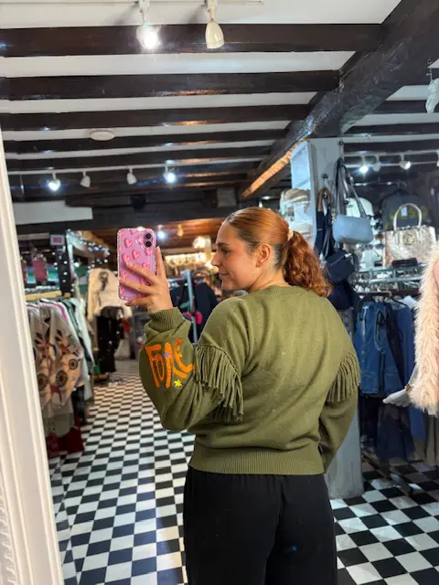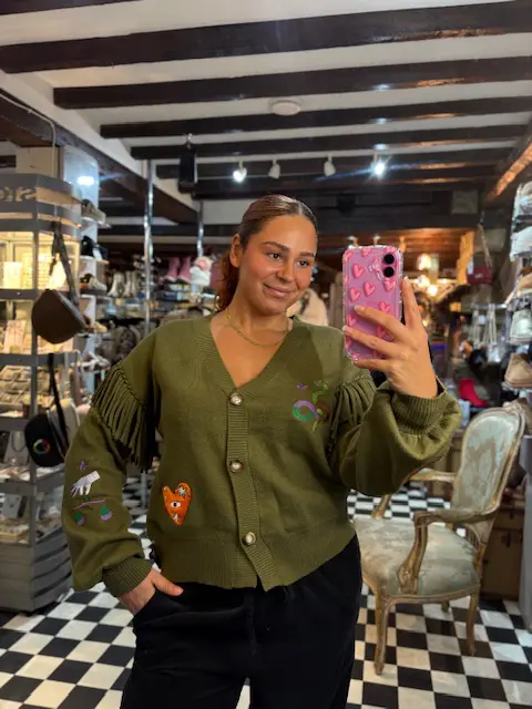 This gorgeous cardigan features mystic symbols adding pops of colour to the look and tassels along the sleeves.