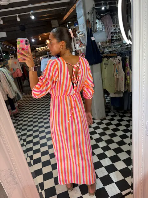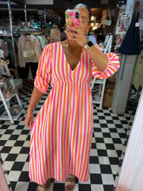 Add some colour to your summer looks with this fun neon stripe cotton maxi dress. Elastic waist. Comfortable and airy fit , nice and light weight.