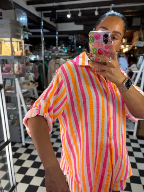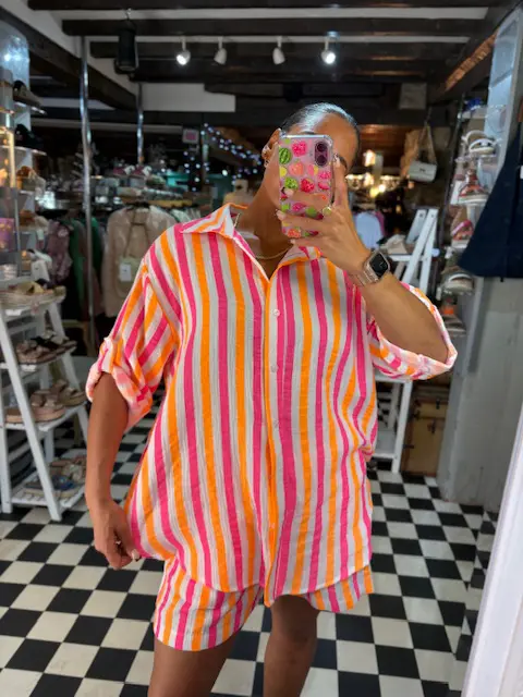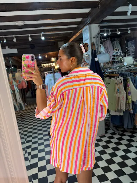 Be bright and bold this summer in this fun neon stripe cotton oversize shirt style tOp. Can be worn in many ways. Perfect and light weight for those warm summer days.