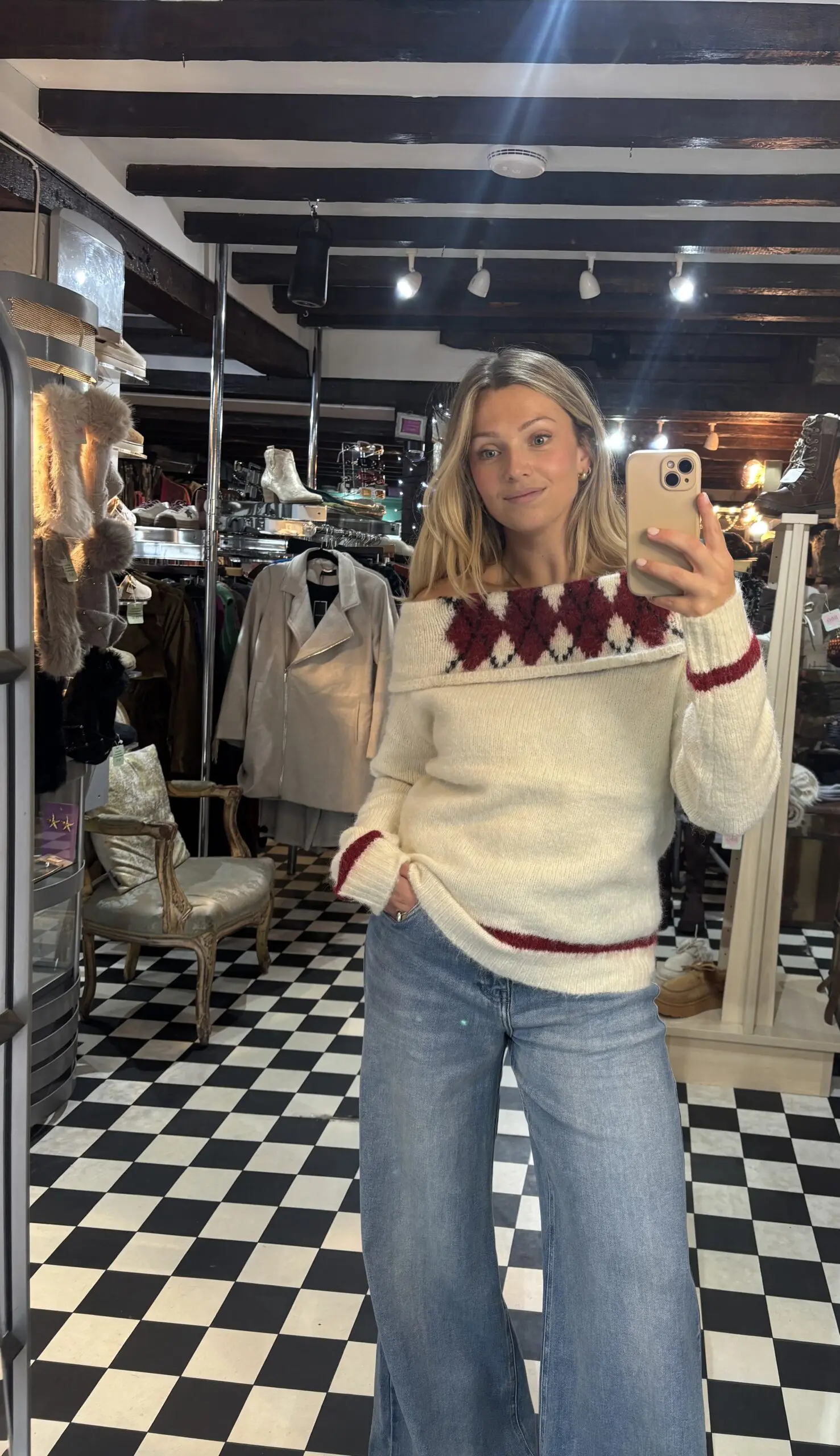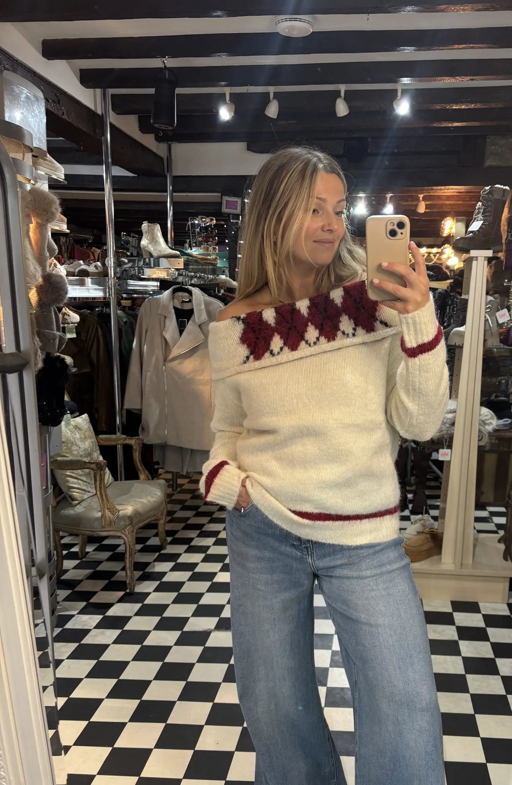 Super soft and warm off the shoulder cream knit jumper with burgundy detailing. One size fit.