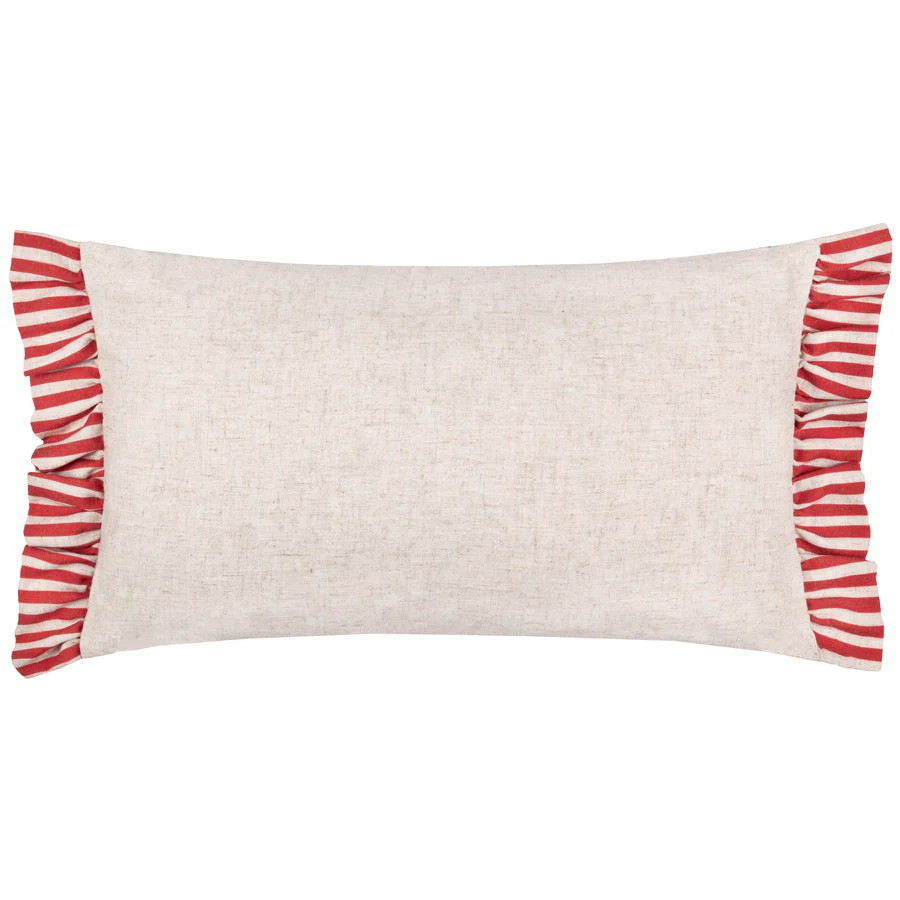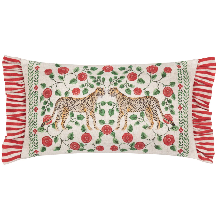 The Okara Leopards Printed Ruffle Cushion merges modern design with an appreciation for the natural world. Featuring a hand-painted motif inspired by Indian Chintz, it showcases painterly florals that frame powerful jungle creatures in a striking mirrored design.