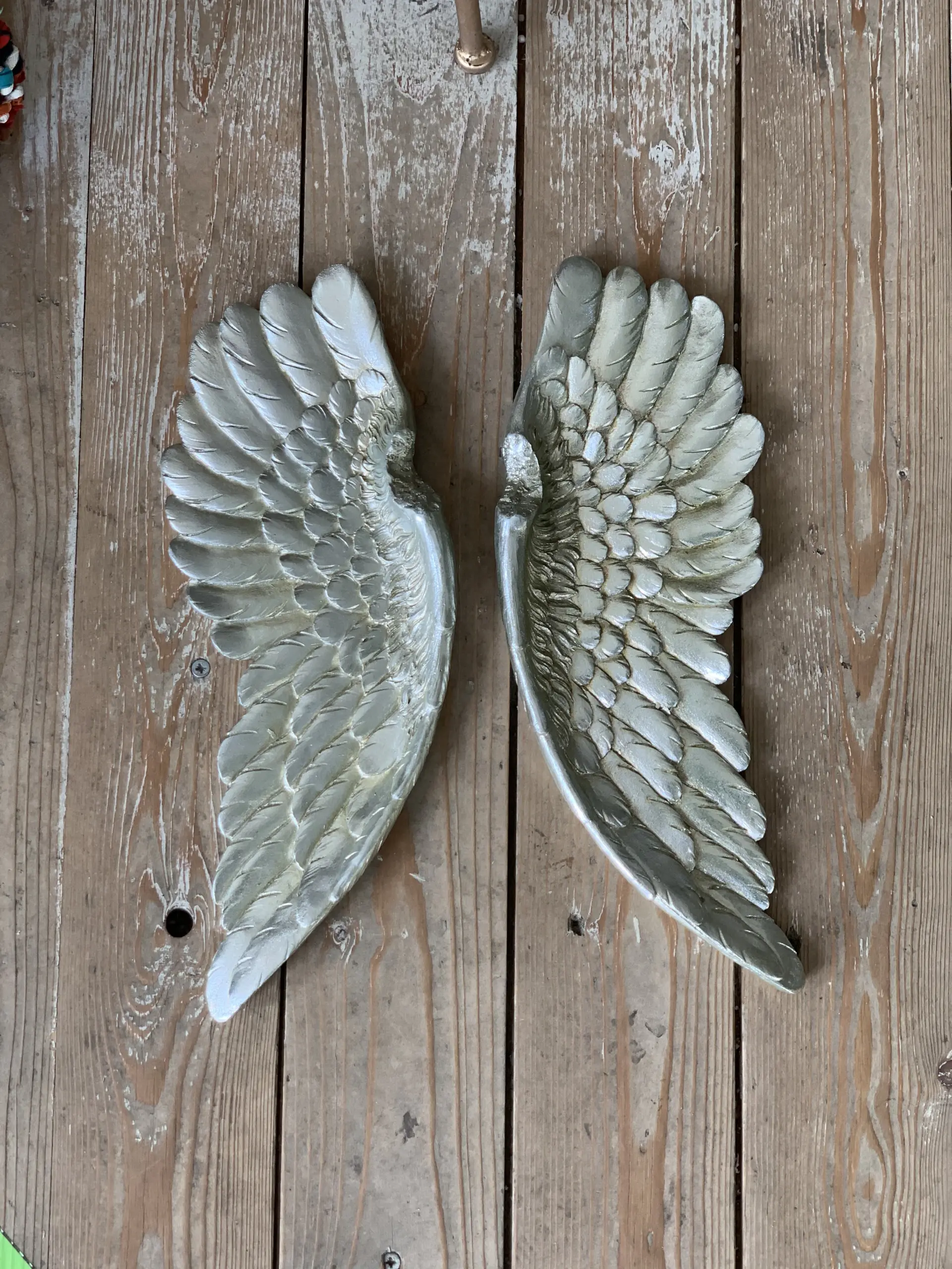 Pair of small antique silver angel wings. These look perfect on a wall as decor in your home.