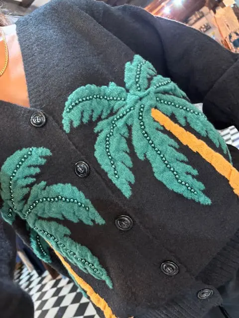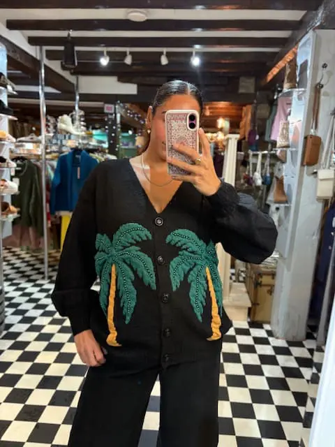 Beautiful new oversized cardigan , extra cosy and extra cute features two knitted palm trees on the front with little green pearl embellishments