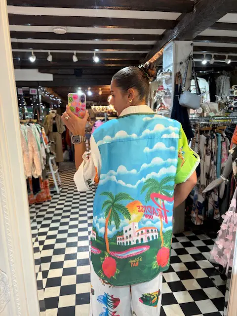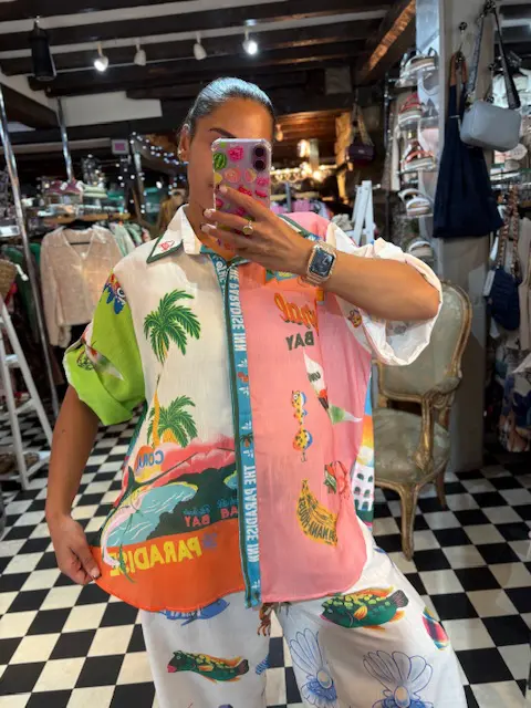 This bright and bold version of our beloved paradise inn symbol print shirt features an asymmetrical style where the back of the shirt drops down a lot lower. Perfect for those summer days. These shirts can be worn open, done up, tied however you wish.