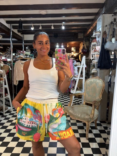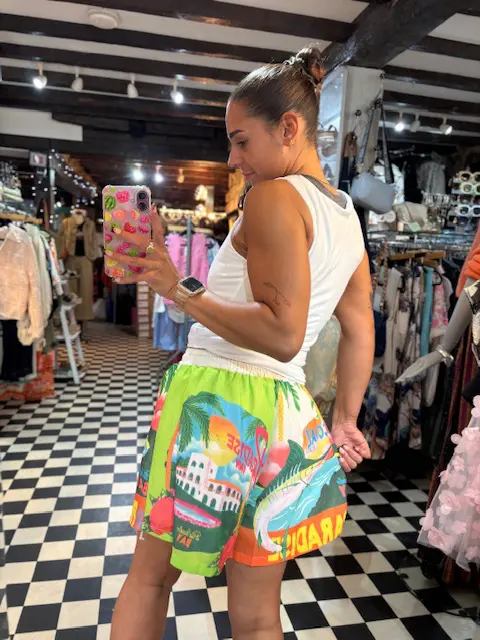 These shorts are super summer vibes! Double lined and feature a nice waistband, pockets and a tie string to adjust the size accordingly. The paradise inn symbol print is loved by lots of us!