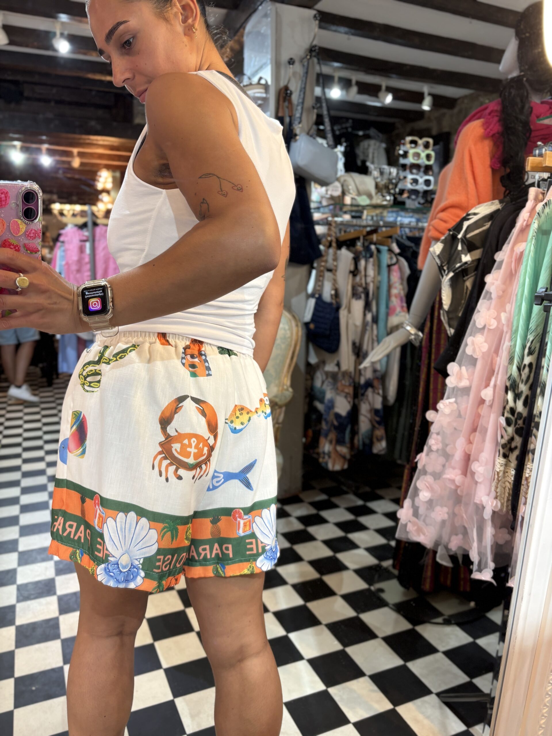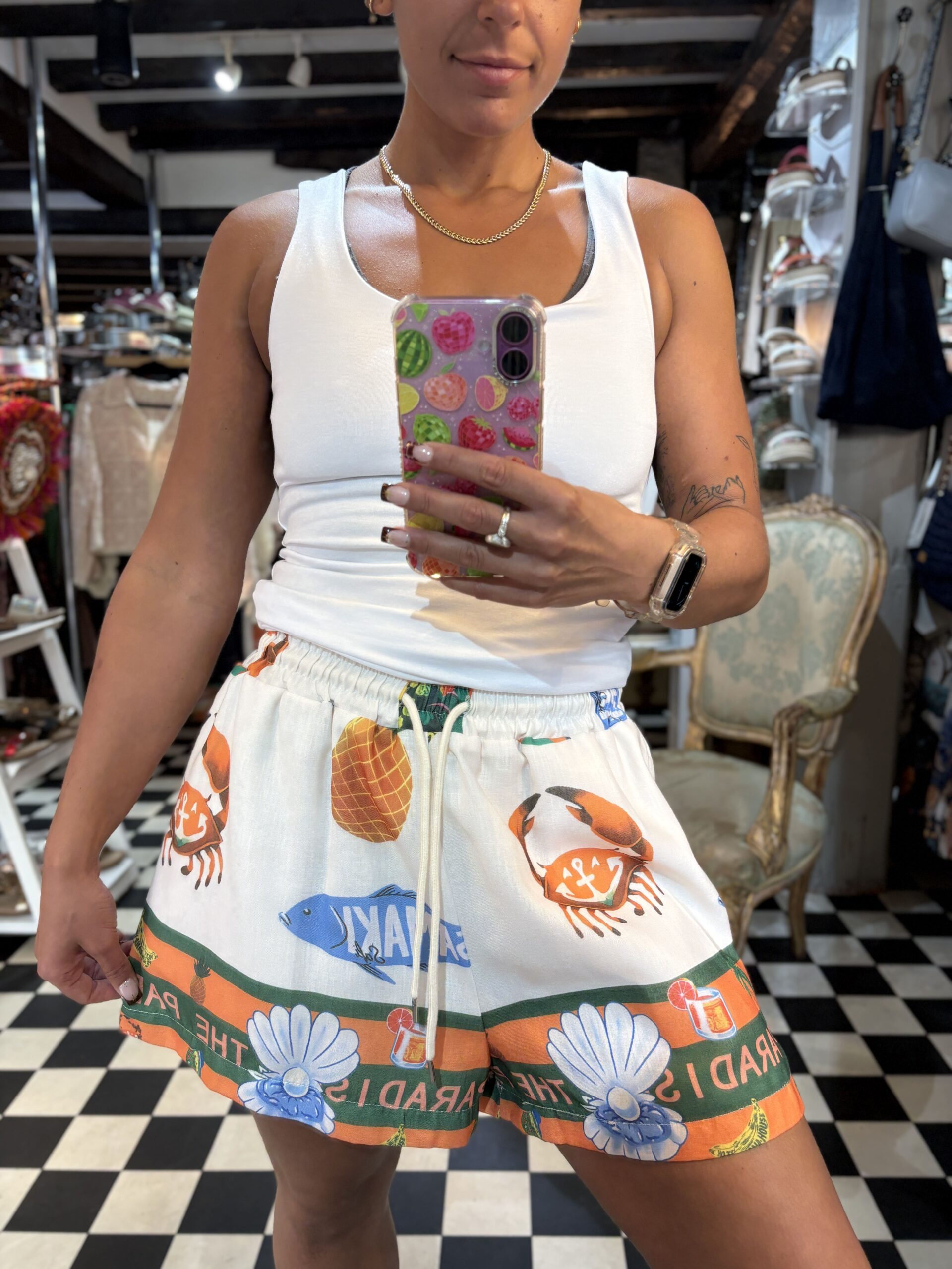 These shorts are super summer vibes! Double lined and feature a nice waistband, pockets and a tie string to adjust the size accordingly. The paradise inn symbol print is loved by lots of us!