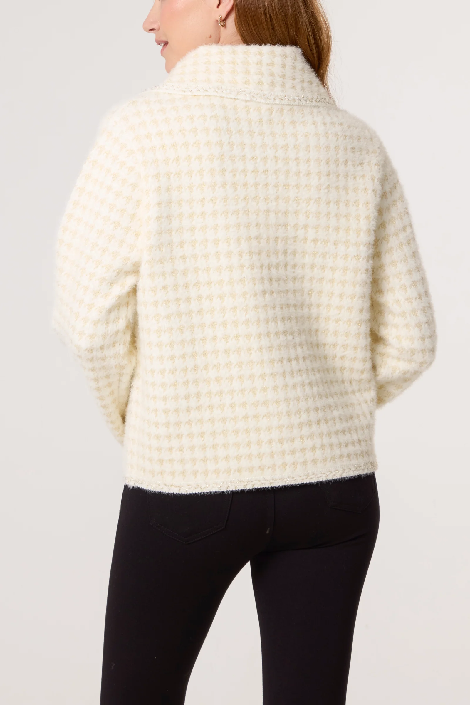 Beautiful super soft knit cosy cream and gold shacket style cardigan. Perfect to add to your outfits this season. Looks great dressed up or down. Super chic style. Pearl detail buttons.