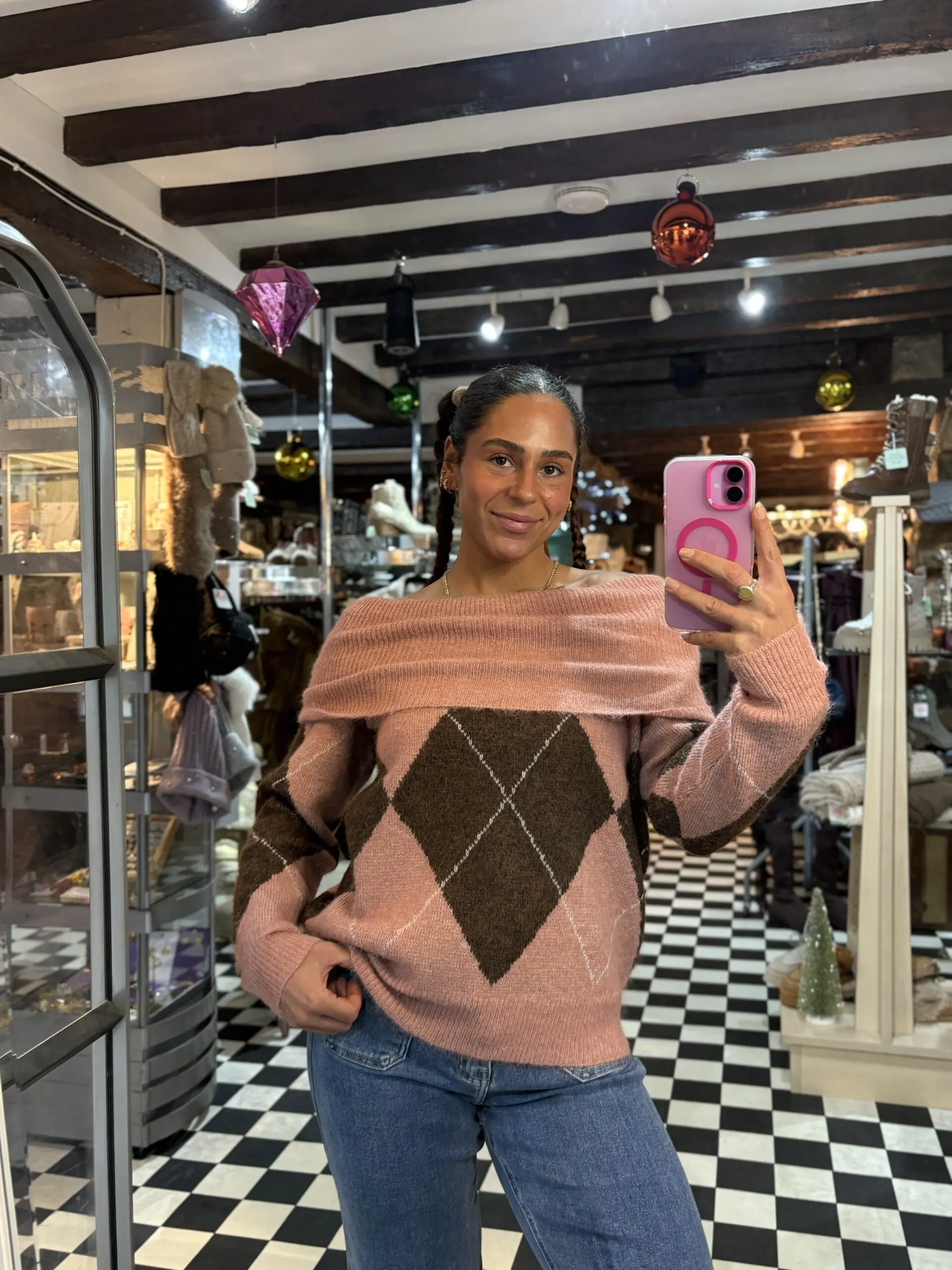 Nice new cosy off the shoulder style jumper features a pattern with a mix of lovely pink and brown tones.