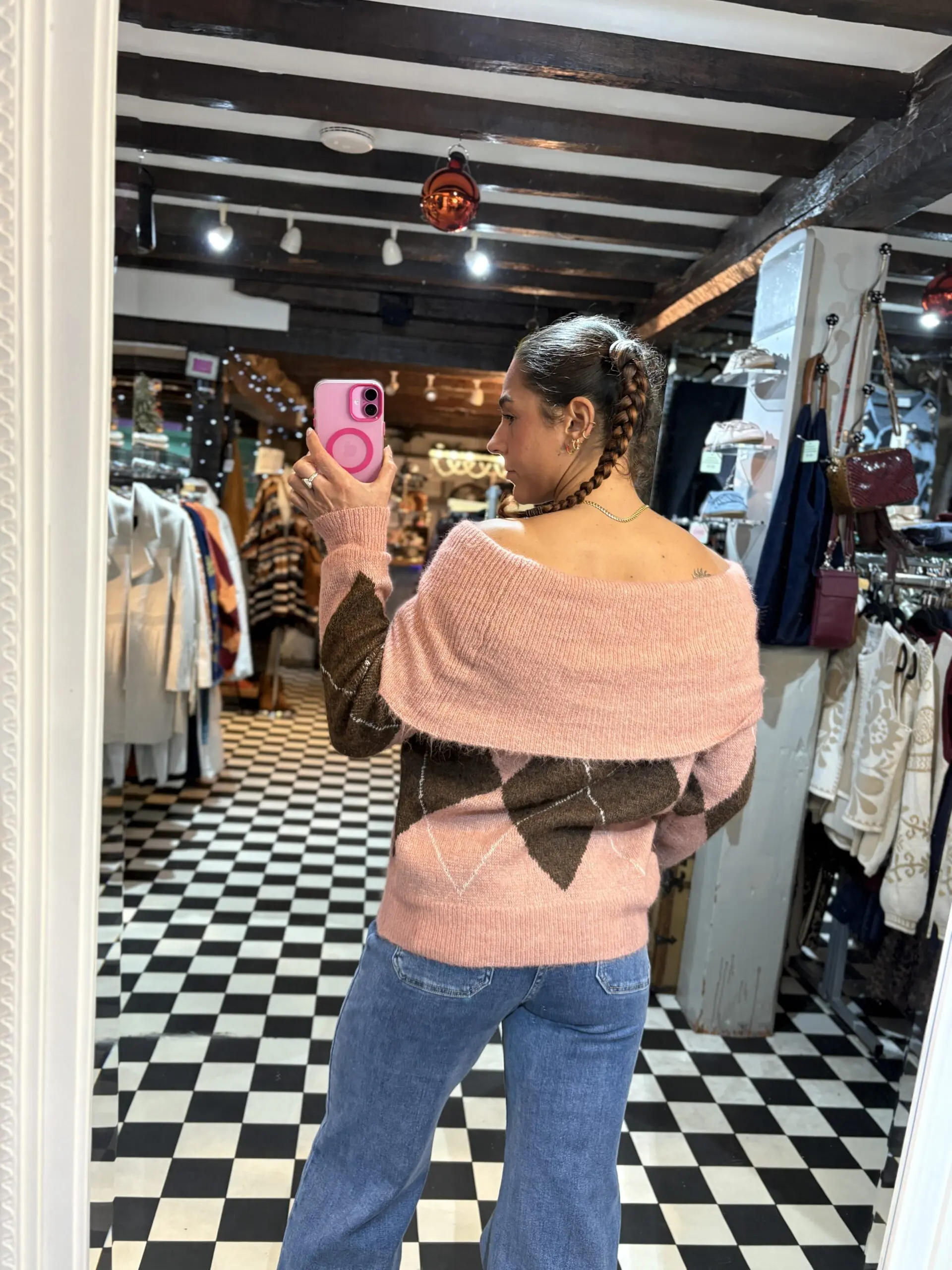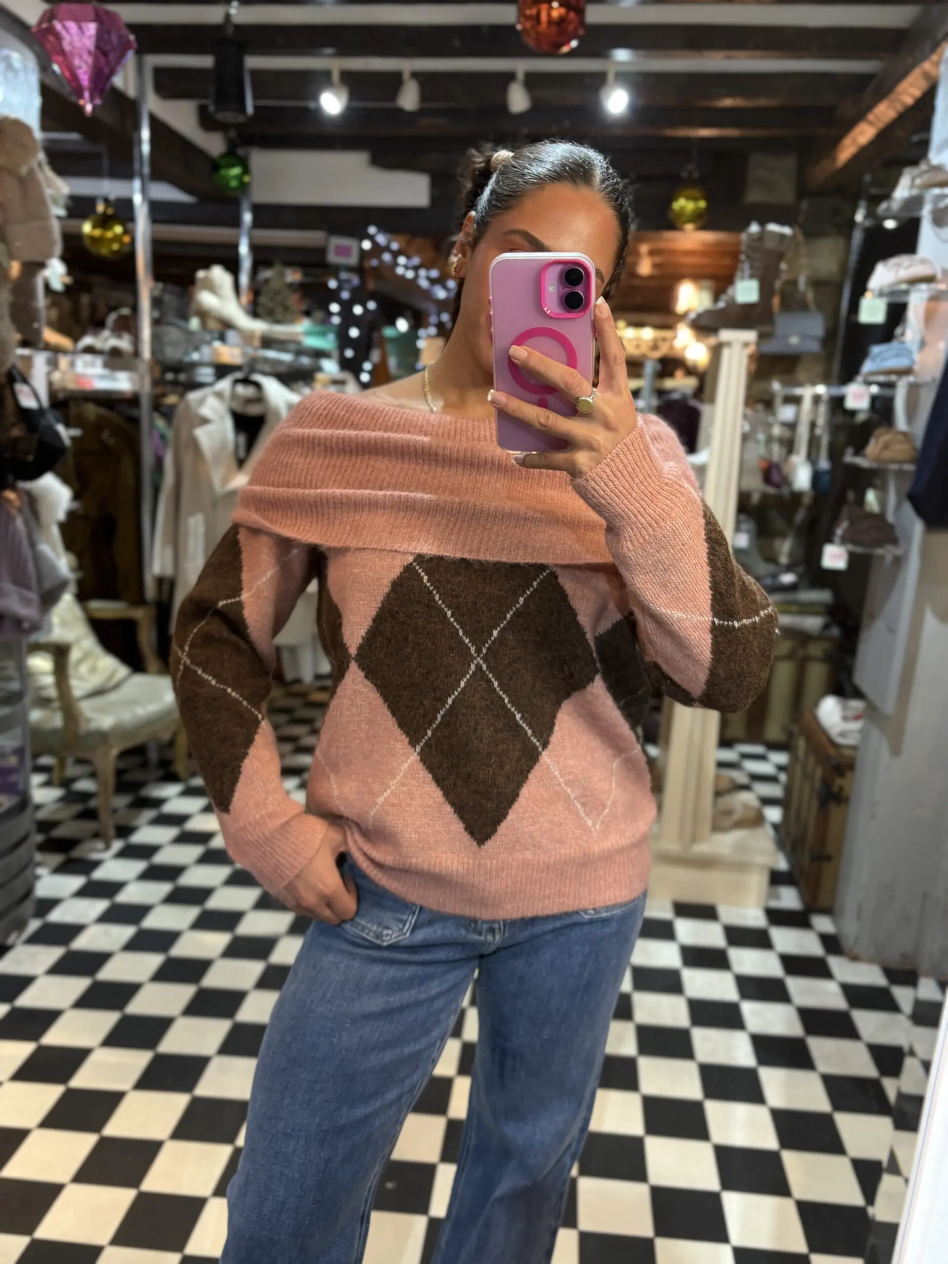 Pink & Brown Off the Shoulder Jumper
