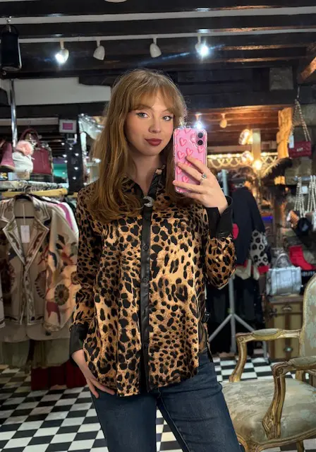 This gorgeous silky leopard print shirt features a PU leather look trim and cuffs. Absolutely love the contrast, this shirt looks great worn done up or open / tied. Great for the office or dressed up for an occasion.