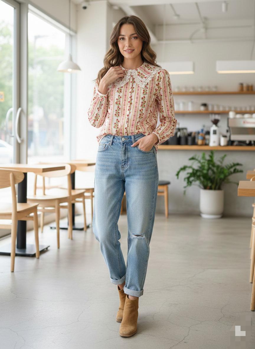 This cute baby doll collar blouse is so wearable and transitional in 100 % cotton