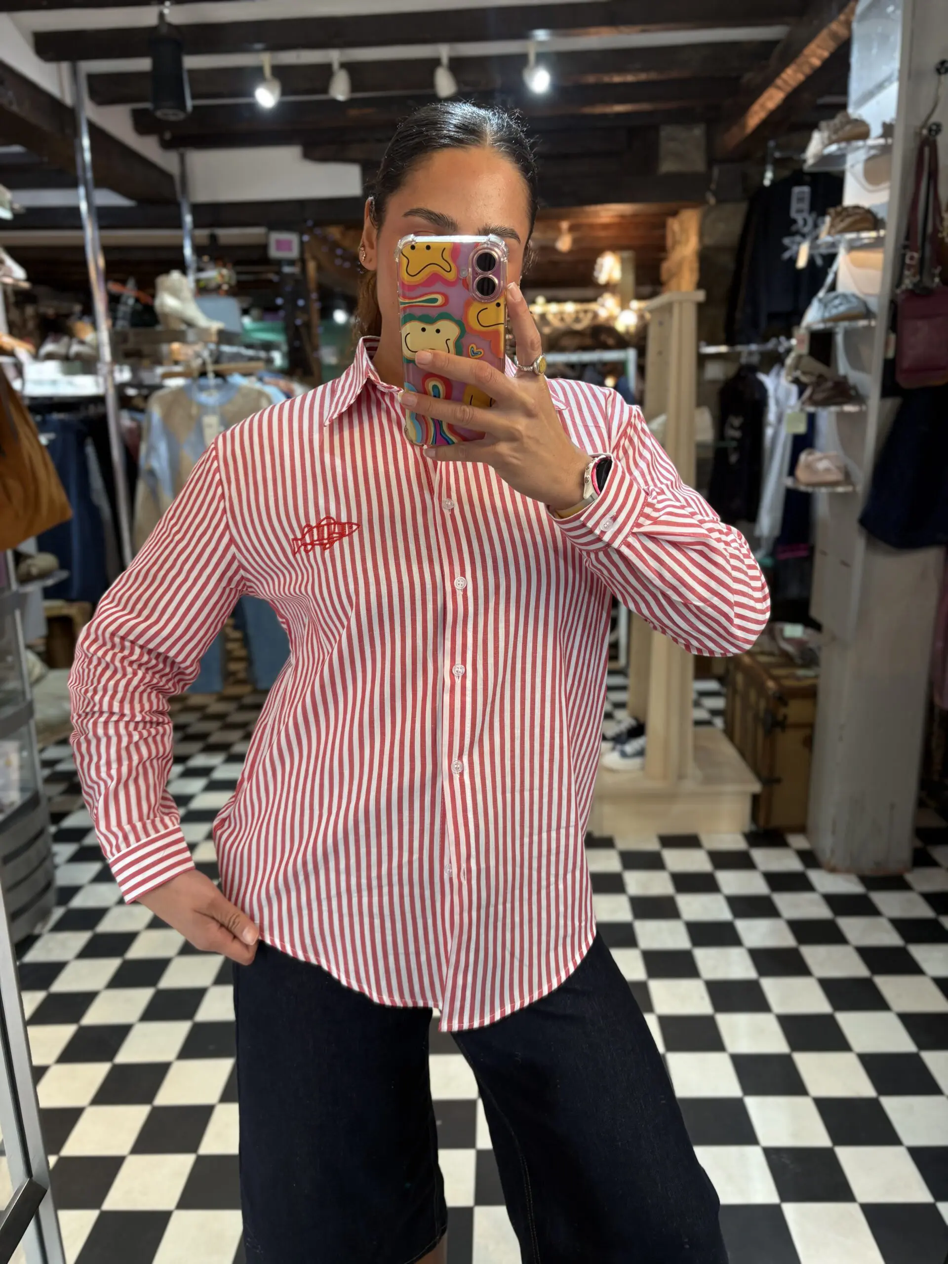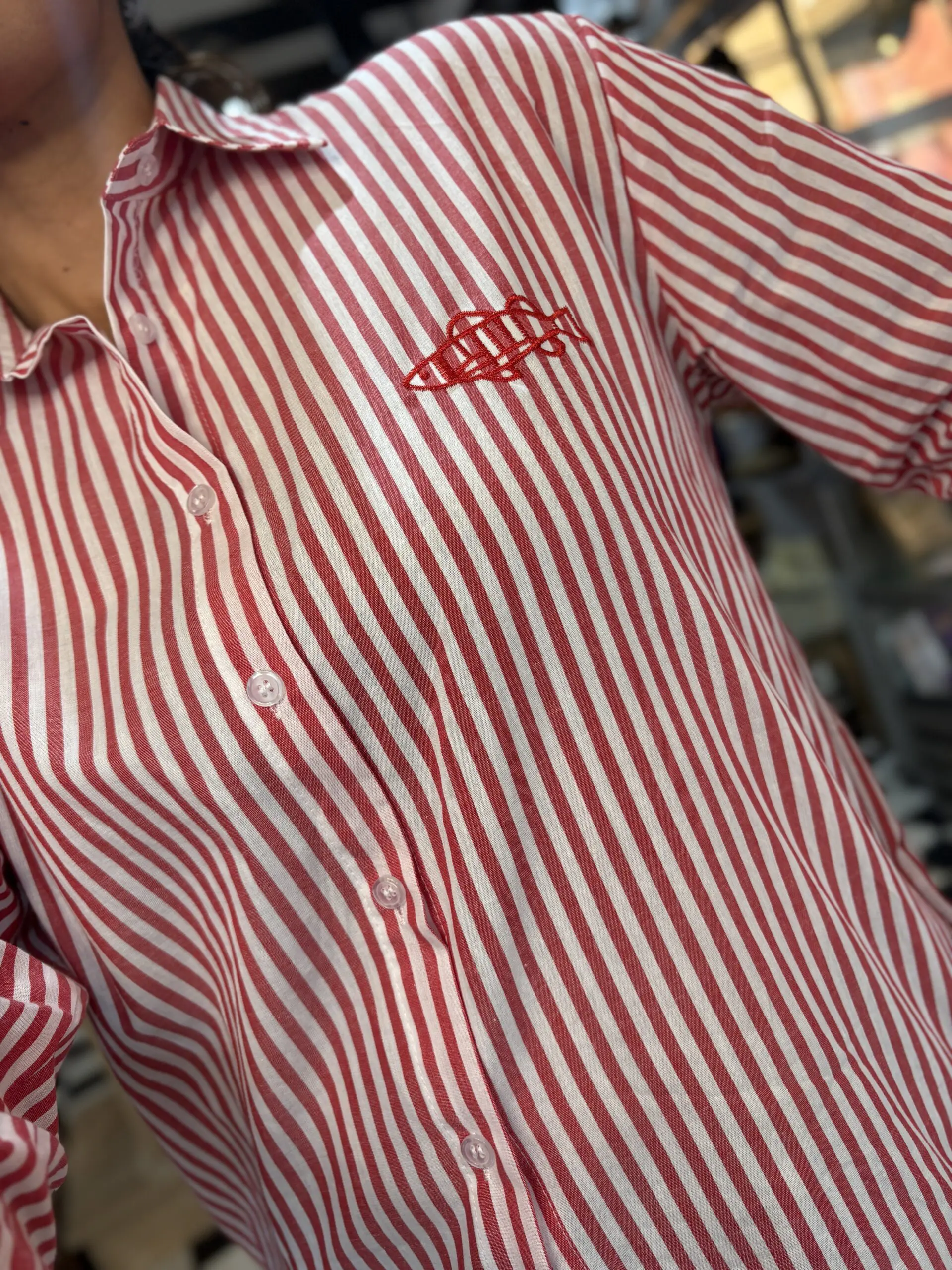 Fresh summer vibes with this stripe pattern cotton shirt. Nice and lightweight, perfect for layering on wearing on its own. Cute little sardine fish embroidered on the shoulder.