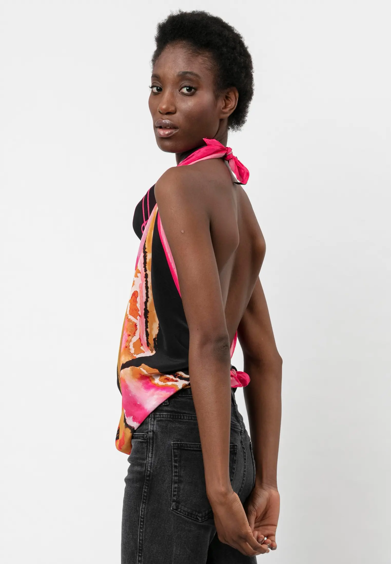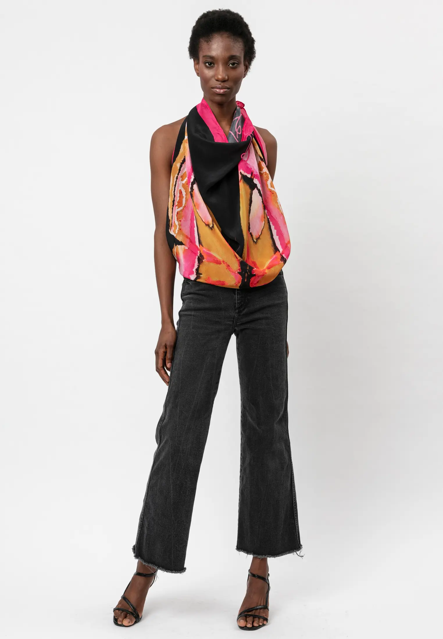 With its bold colourful print with pink and orange tones it is sure to add a splash or colour to your wadrobe.