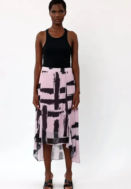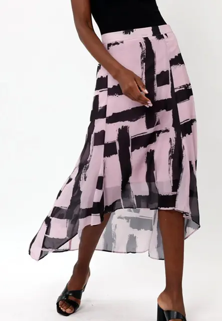No summer wardrobe is complete without a printed midi skirt. The Gallant midi skirt in our had painted abstract print in pink and black tones has an hi-low hem and an elasticated back waist for ease and comfort. Wear with the matching Gallant top or Delight shirt for a full look. The skirt has a short lining. The model wears a size S.