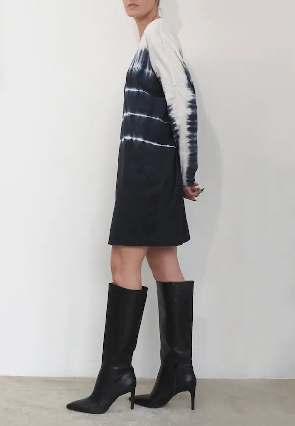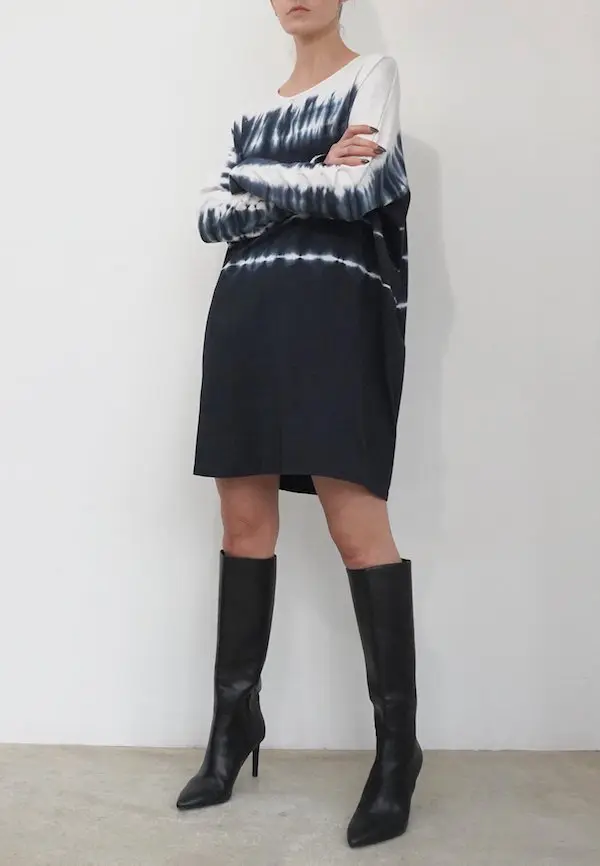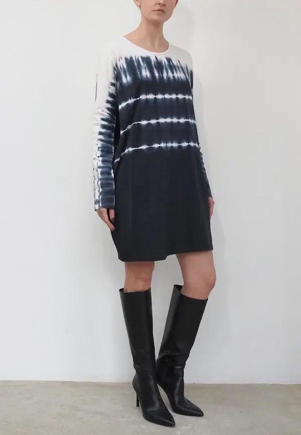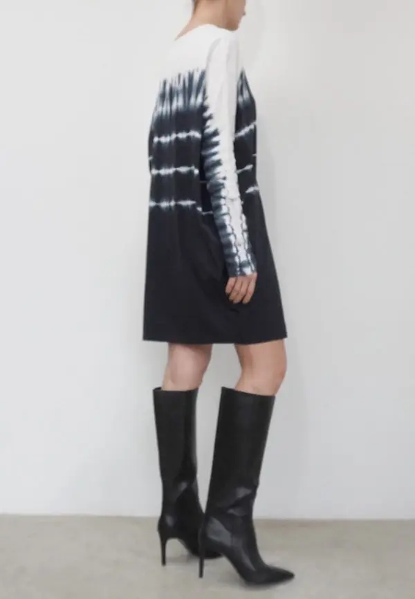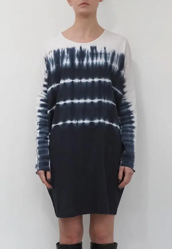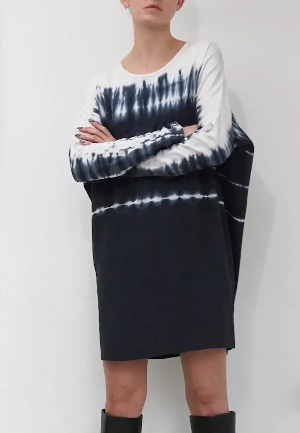 The Glance dress combines comfort with style with its hand tie dye in black and white on a soft cotton jersey. This style features a short length, round neckline and long sleeves. This style has an oversized fit, please go down 1 size if you like it better less oversized. The model wears a size S. This tie dye is made by hand, there for every piece is unique.