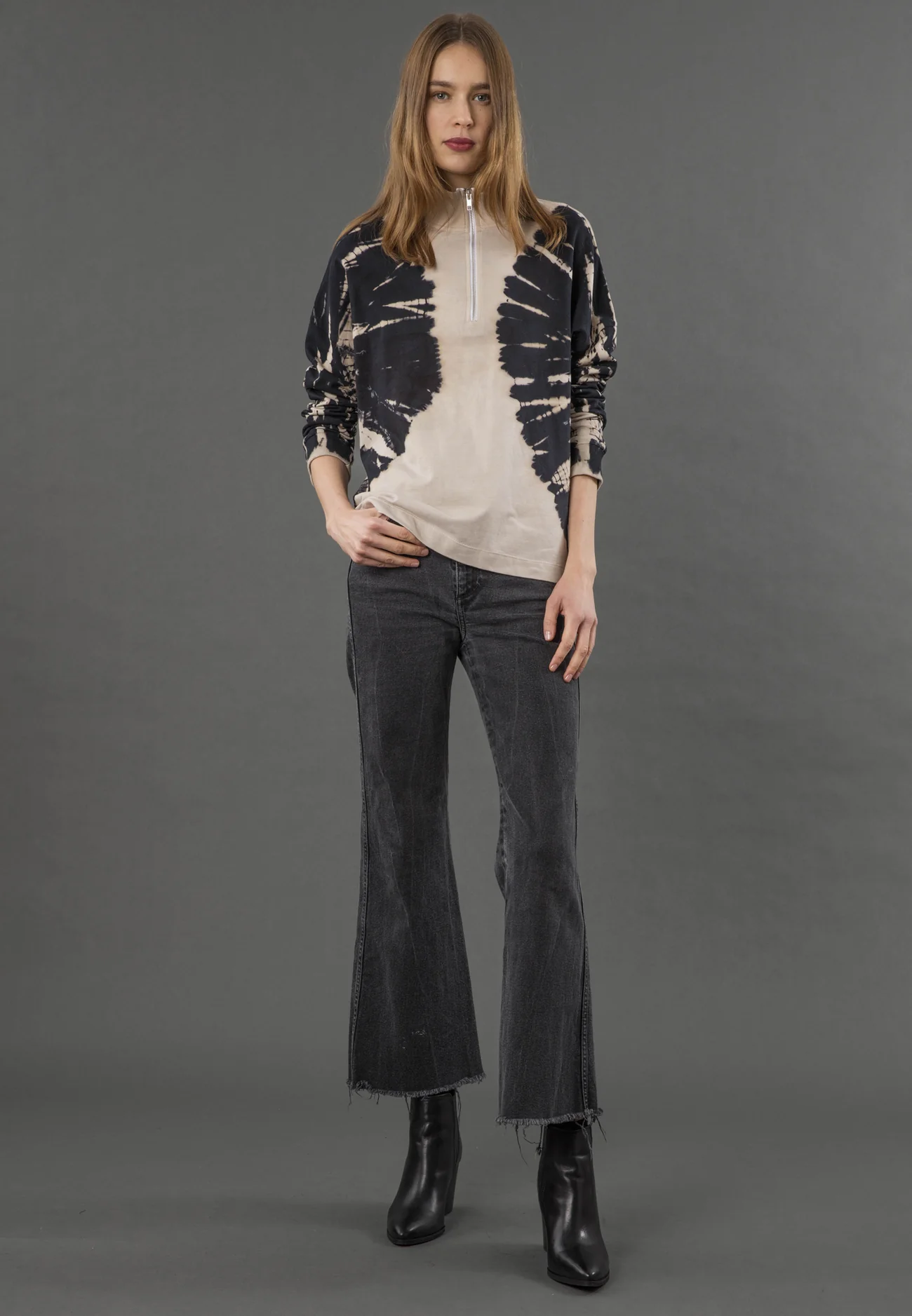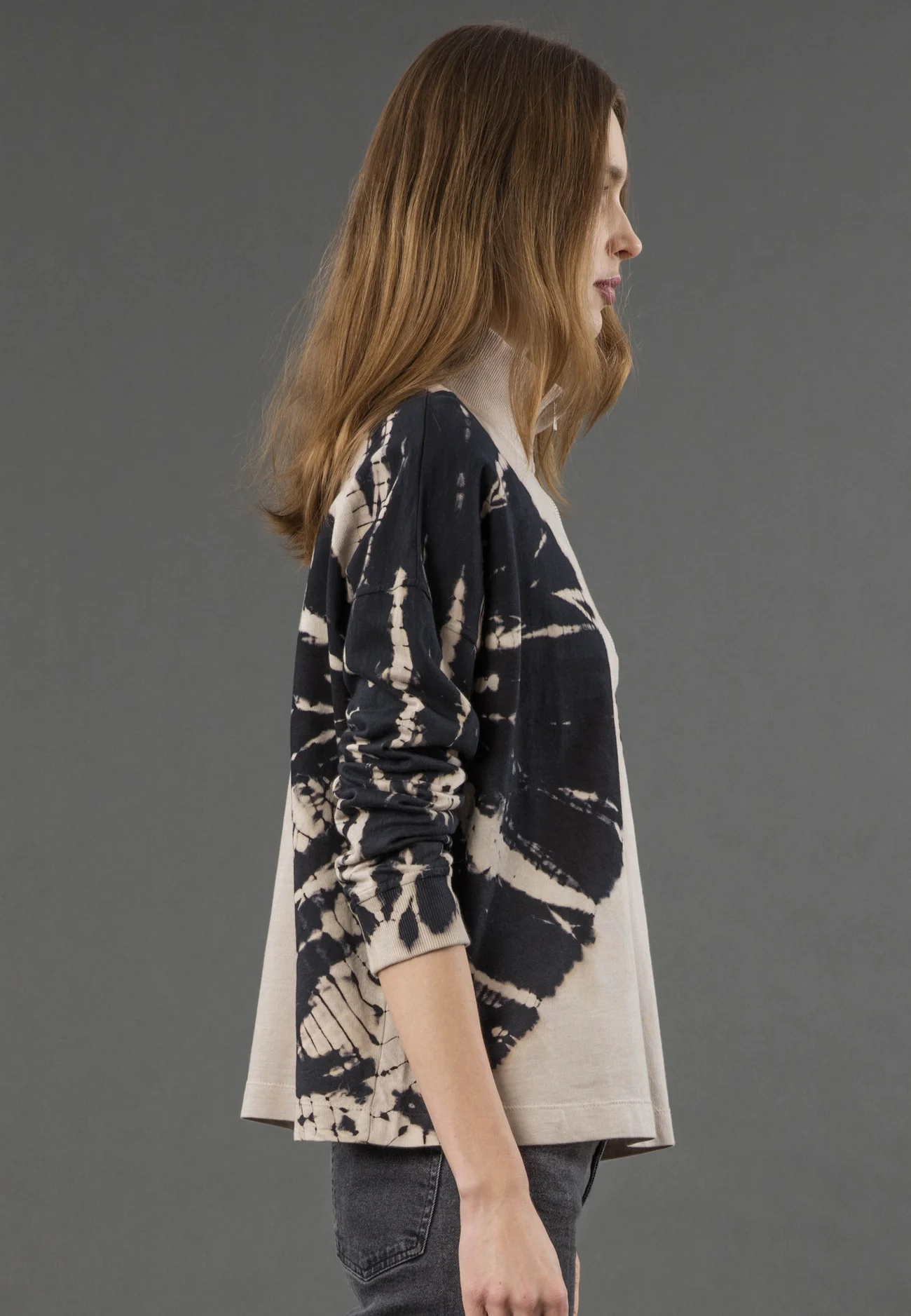 The Jade sweat is a chic and versatile addition to your casual wardrobe. Crafted from soft cotton, this sweat jumper offers both comfort and style. The rib neckline features a trendy zip detail, adding a modern touch to the classic design. Adorned in a striking tie-dye pattern in taupe tones, it brings a bold and contemporary vibe to any outfit. With its hip-length silhouette, long sleeves and relaxed fit, the Jade sweat is perfect for effortless layering. Dress it up with tailored trousers and statement jewellery for a polished look, or keep it casual with jeans and sneakers for a laid-back vibe. The model wears a size S. Length from the top: 62 cm. Dry clean only