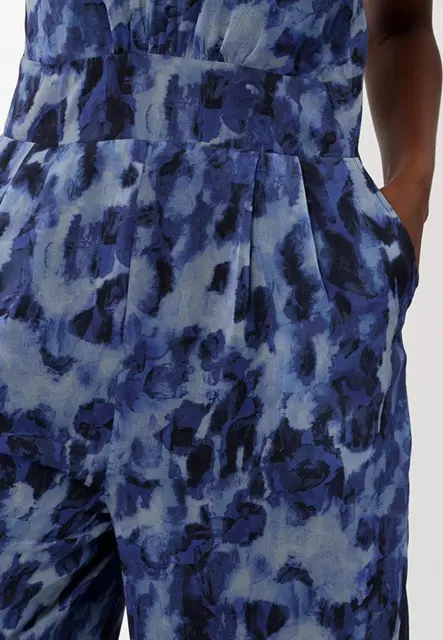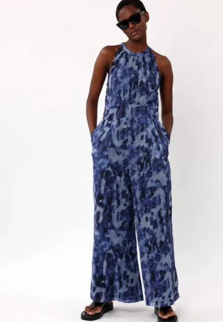 The Noble jumpsuit is the ultimate all-in-one statement piece with its hand-painted abstract print in blue tones. This style features a flattering halter neck with a fitted waist and a wide leg with pockets. A perfect desk-to-dinner style that would also be great as occasion wear. The model wears a size S. This style is made with 50% recycled fabric made out of plastic bottles.
