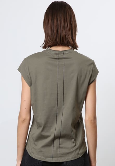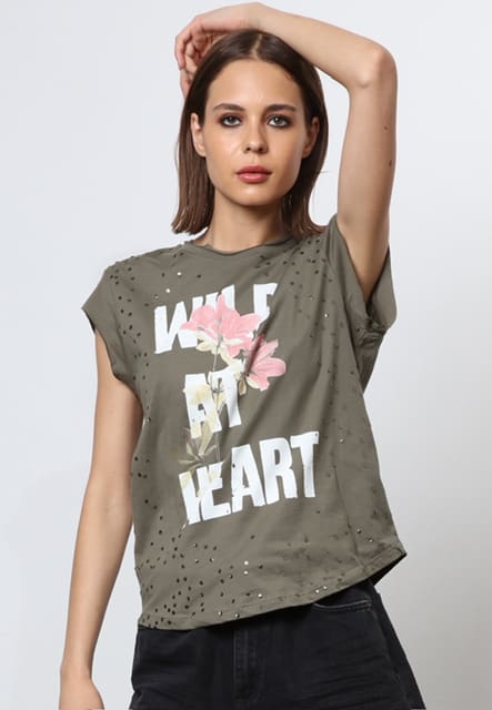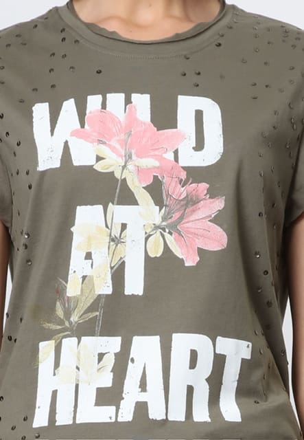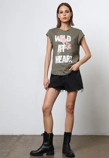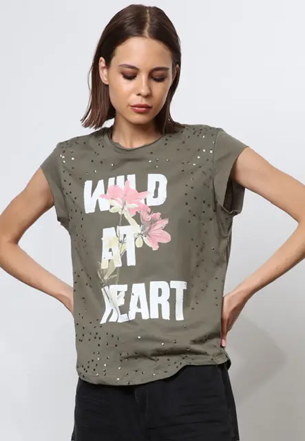 Embrace your wild side with the Wild at Heart tee in khaki, crafted from a soft cotton jersey, cut to a regular fit. It features a Wild at Heart slogan embellished with dazzling sequins on the front, adding a touch of glam to your everyday style. With its raw-edge neckline and cap sleeves, this tee effortlessly exudes a trendy and edgy aesthetic. Model wears size S, length: 62 cm, chest circumference: 98 cm