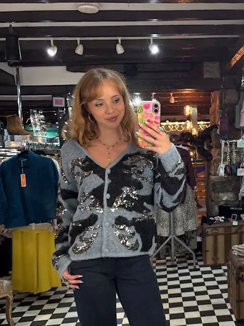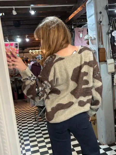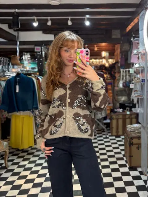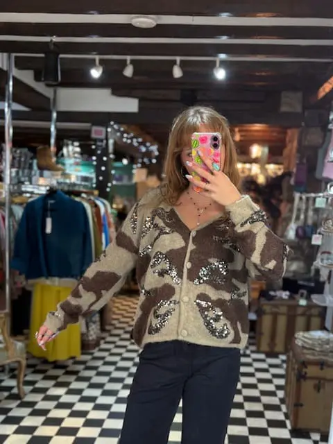 Beautiful luxe camo style Sequin cardigan perfect for those days you wanna be a little extra with your outfit yet still subtle enough you don’t feel it’s too much. Lovely soft and comfortable feel, can be dressed up or down. Perfect layered or on its own. We are obsessed!