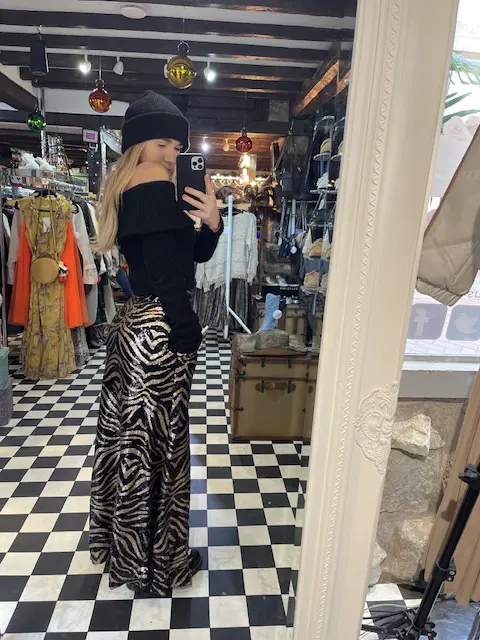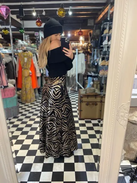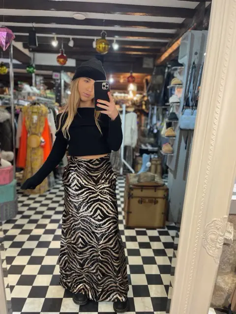 This incredible sequin maxi skirt features a lovely zebra print, pockets and a side zip fastening to help get yourself in and out. This is perfect for party season. Or those days you just need a little bit extra glam on your outfit.