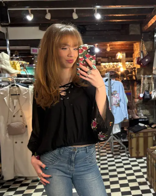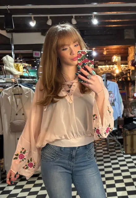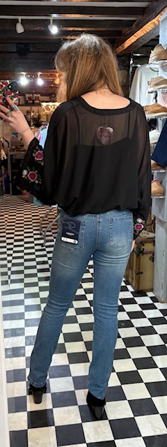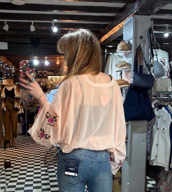 Beautiful sheer floral blouse top features a cropped balloon style sleeve with embroidered floral detail on the cuff.