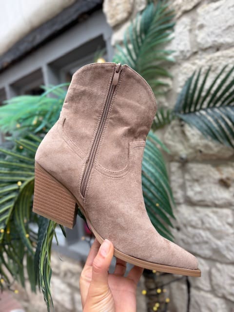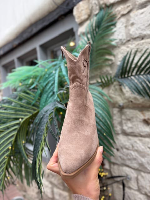 Classic cowboy style boot in a faux suede material. Not too long not too short, looks great with jeans, skirts, shorts you name it..