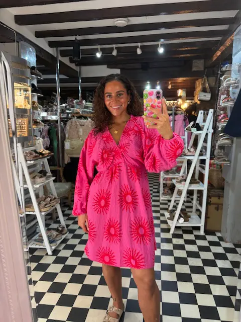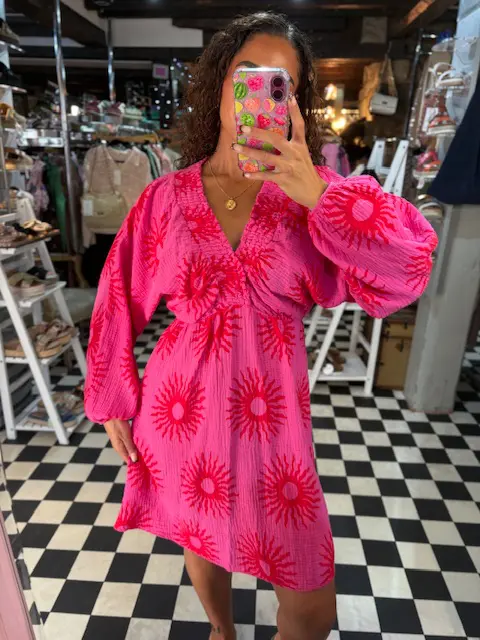 Our new summer sun print in this lovely new v neck short dress style in 2 beautiful colourways. Perfect for summer. Can be dressed up or down. Lightweight and comfortable, elastic waist makes it easy to wear.
