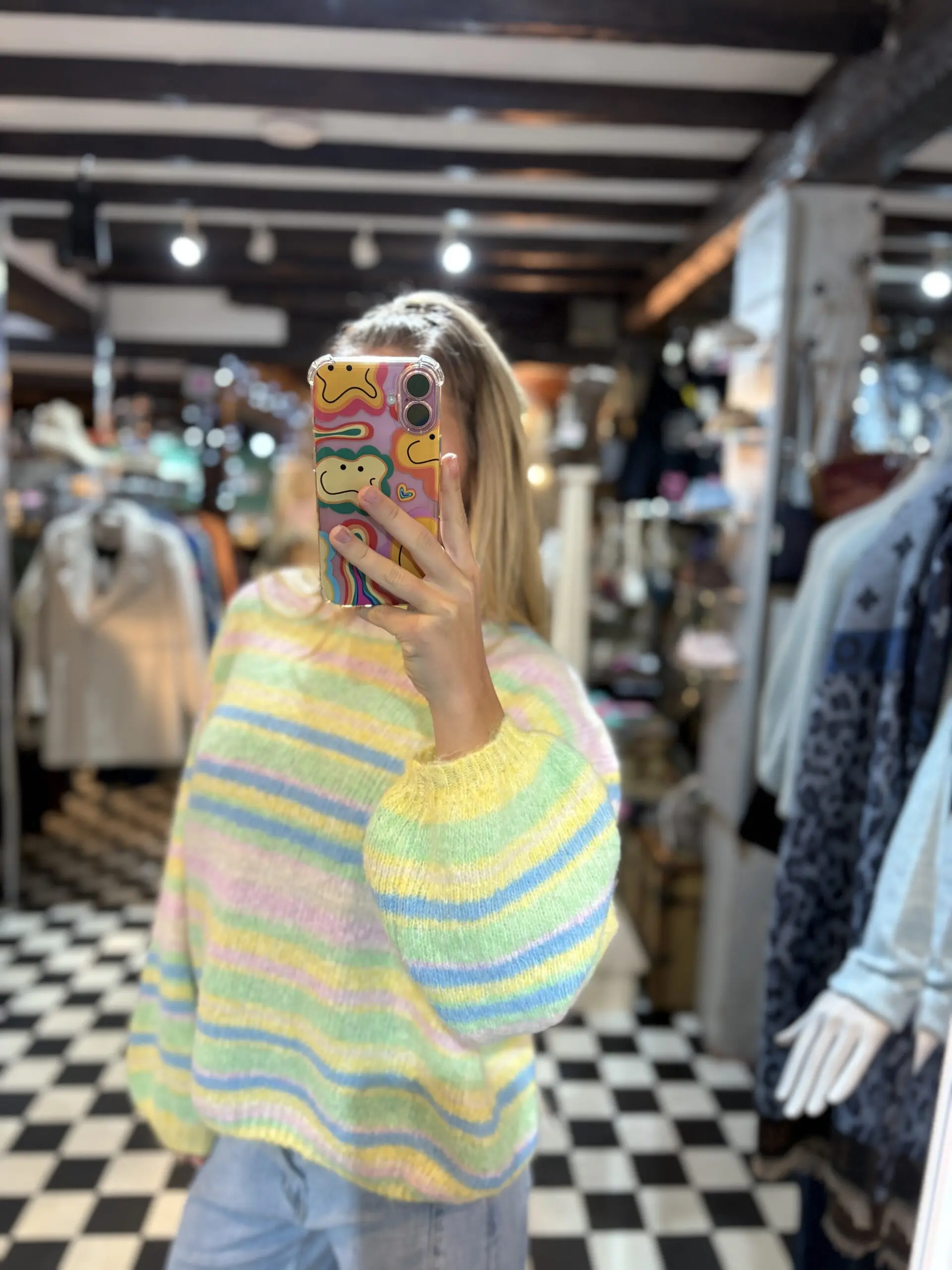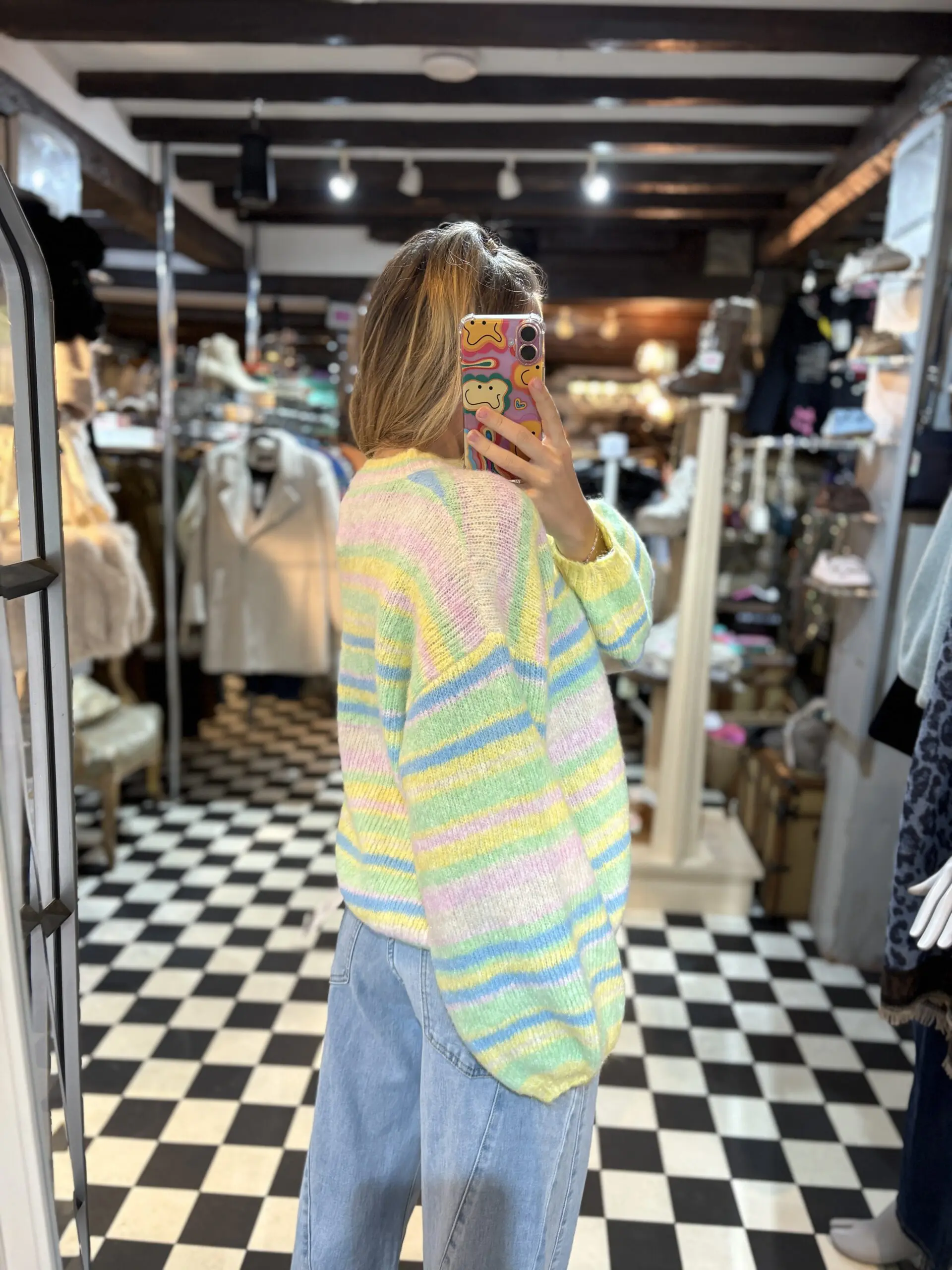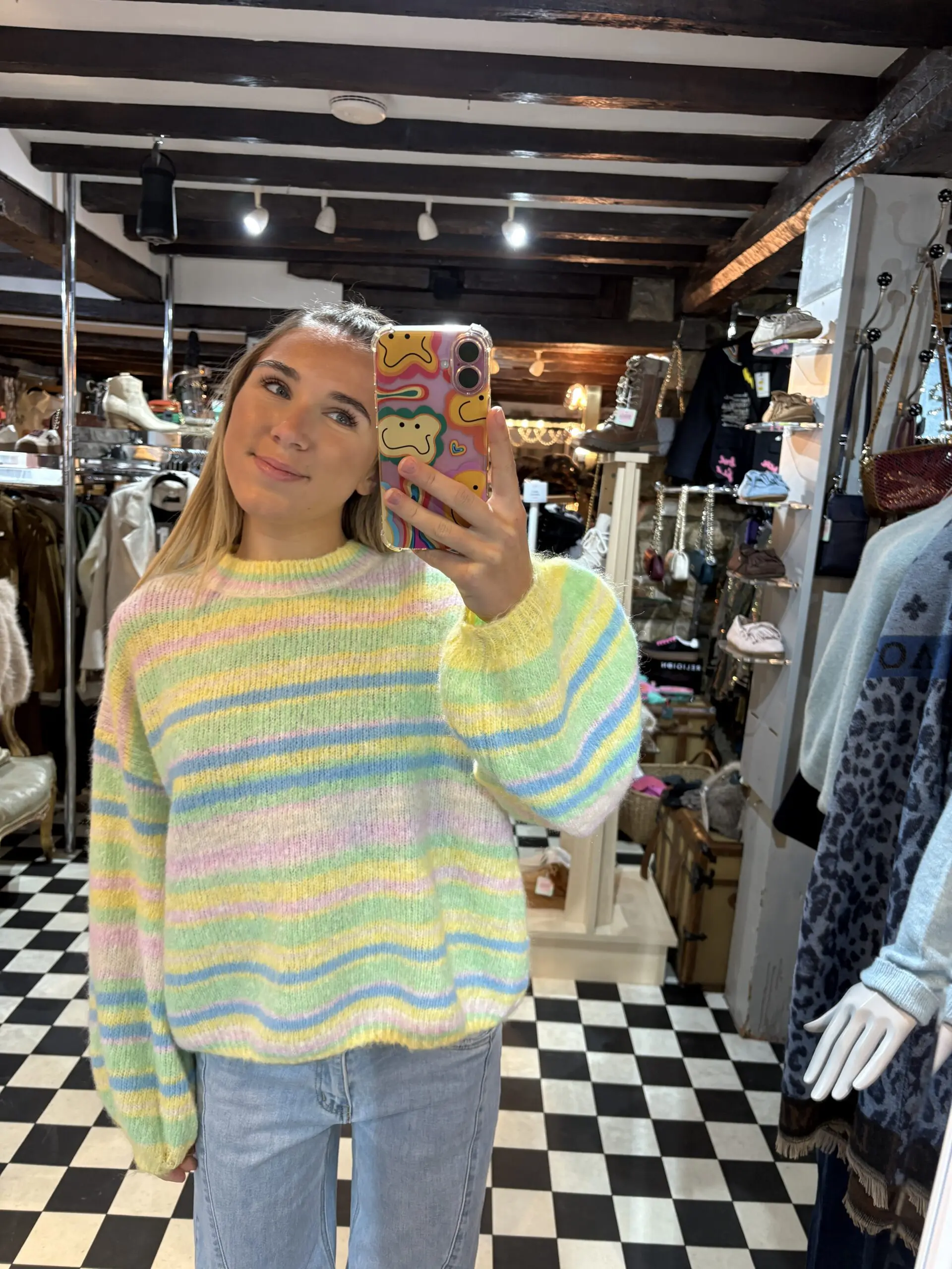 New soft knit stripe jumper with hues of blue, green and yellow with hints of pink. Very ice cream vibes perfect for spring / summer.