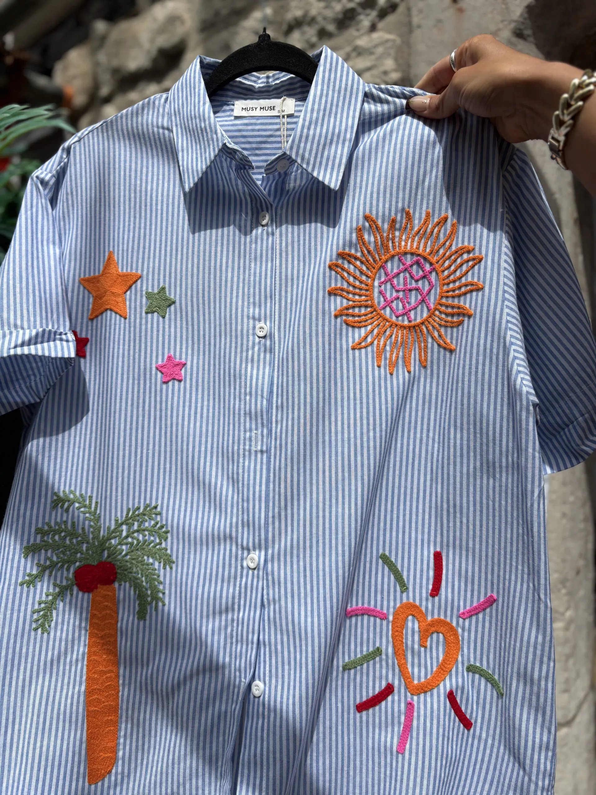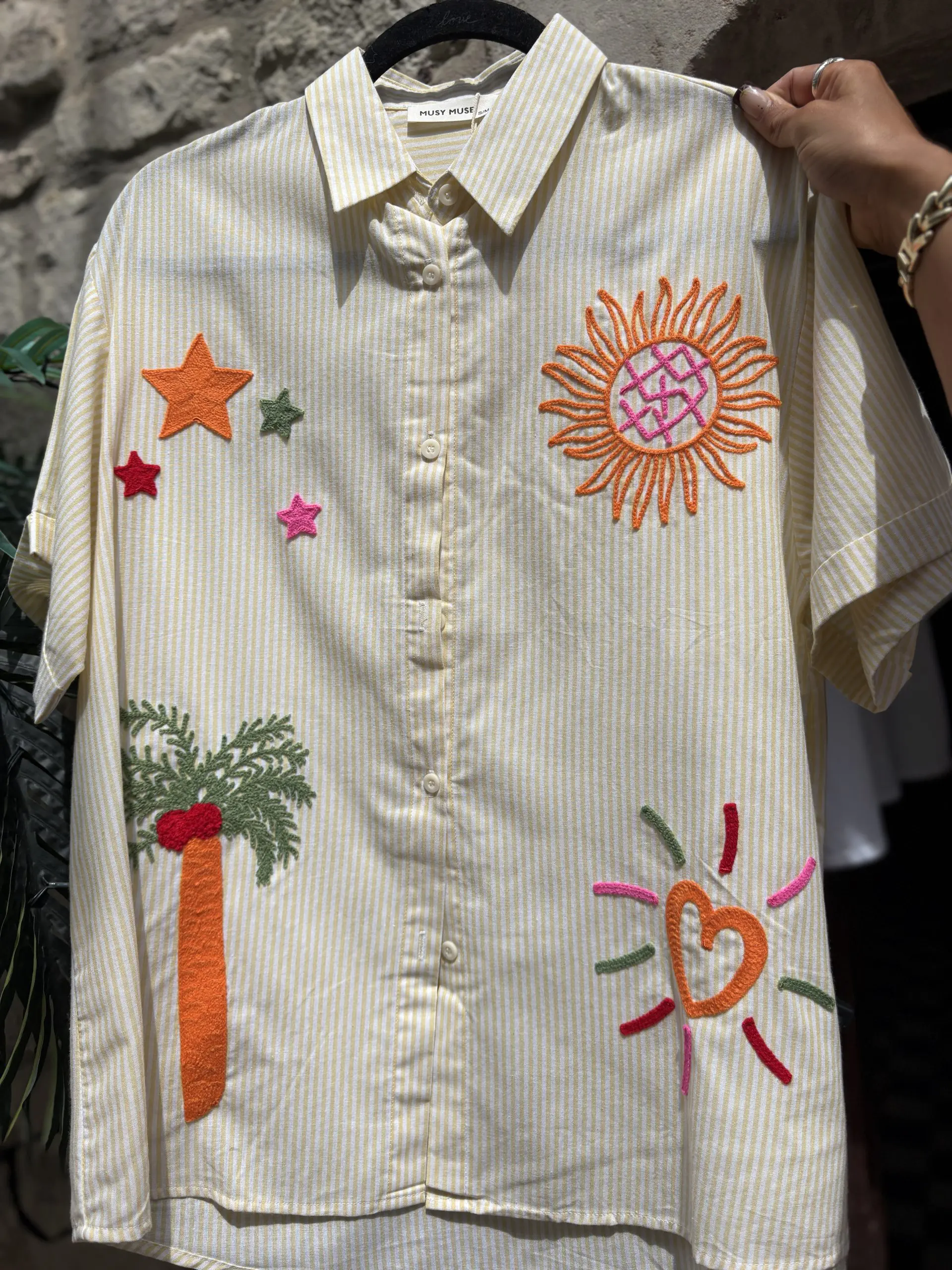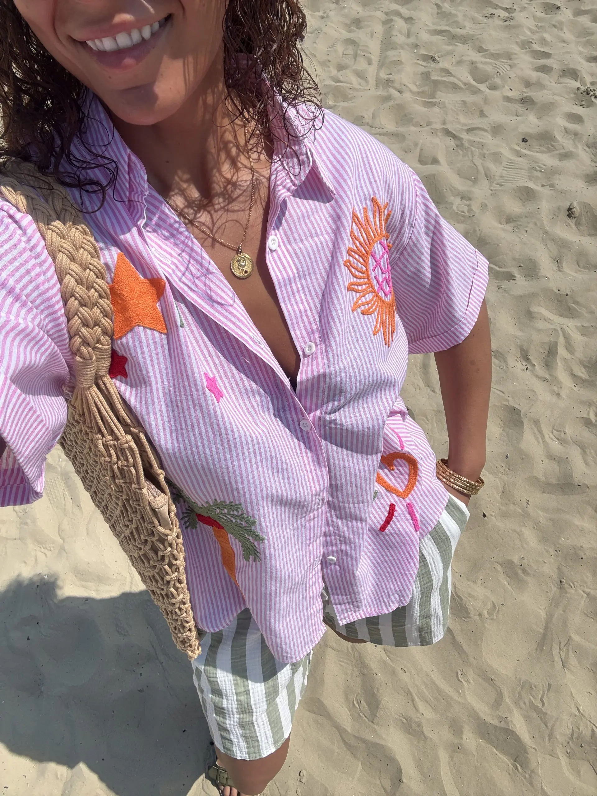 Cool new pinstripe shirts perfect for those summer outfits in 3 new lovely colours. Features an array of embroidered summer symbols on the front.