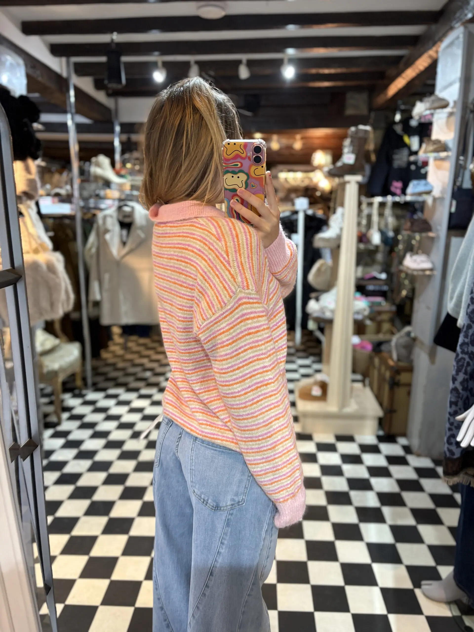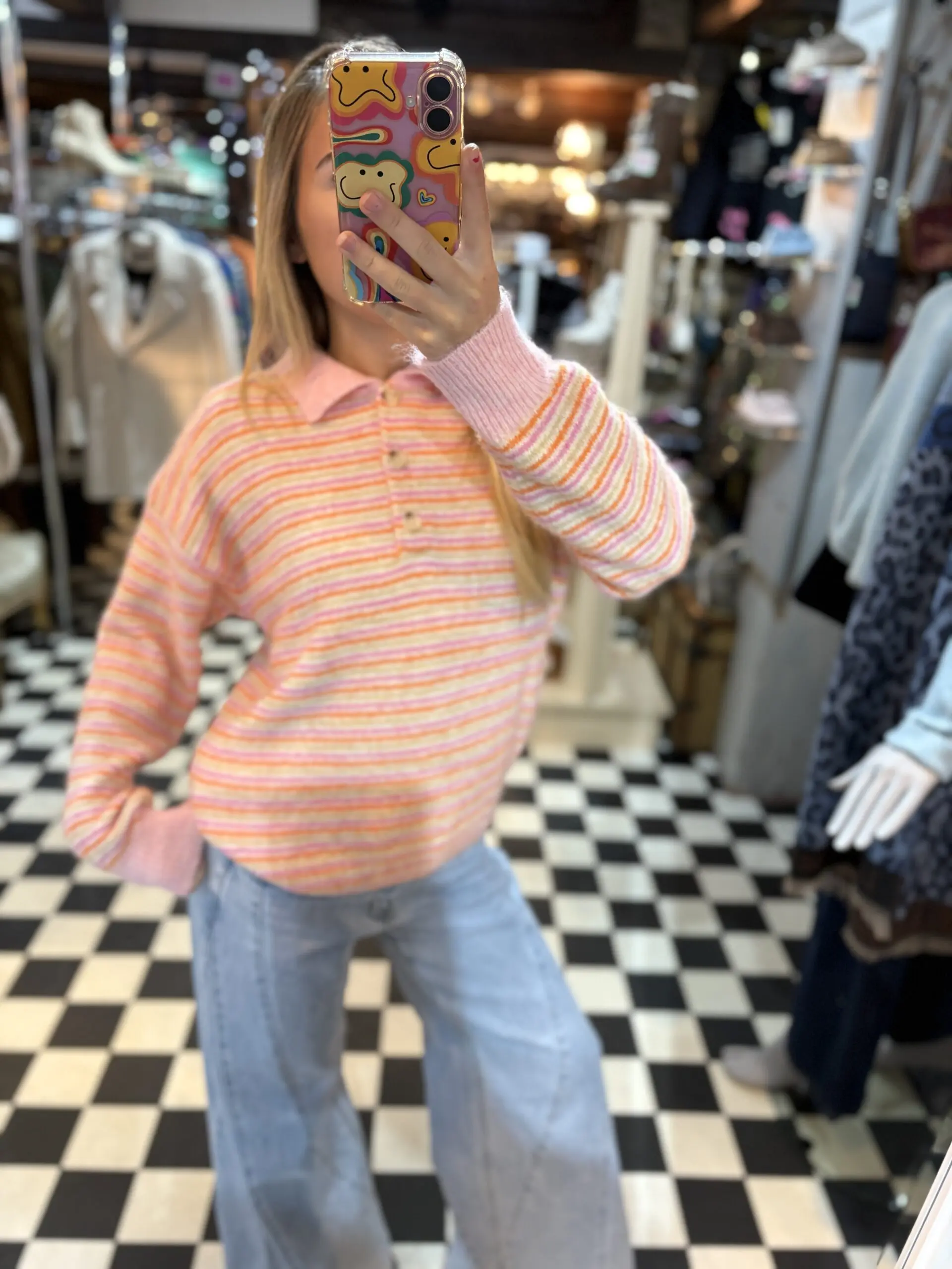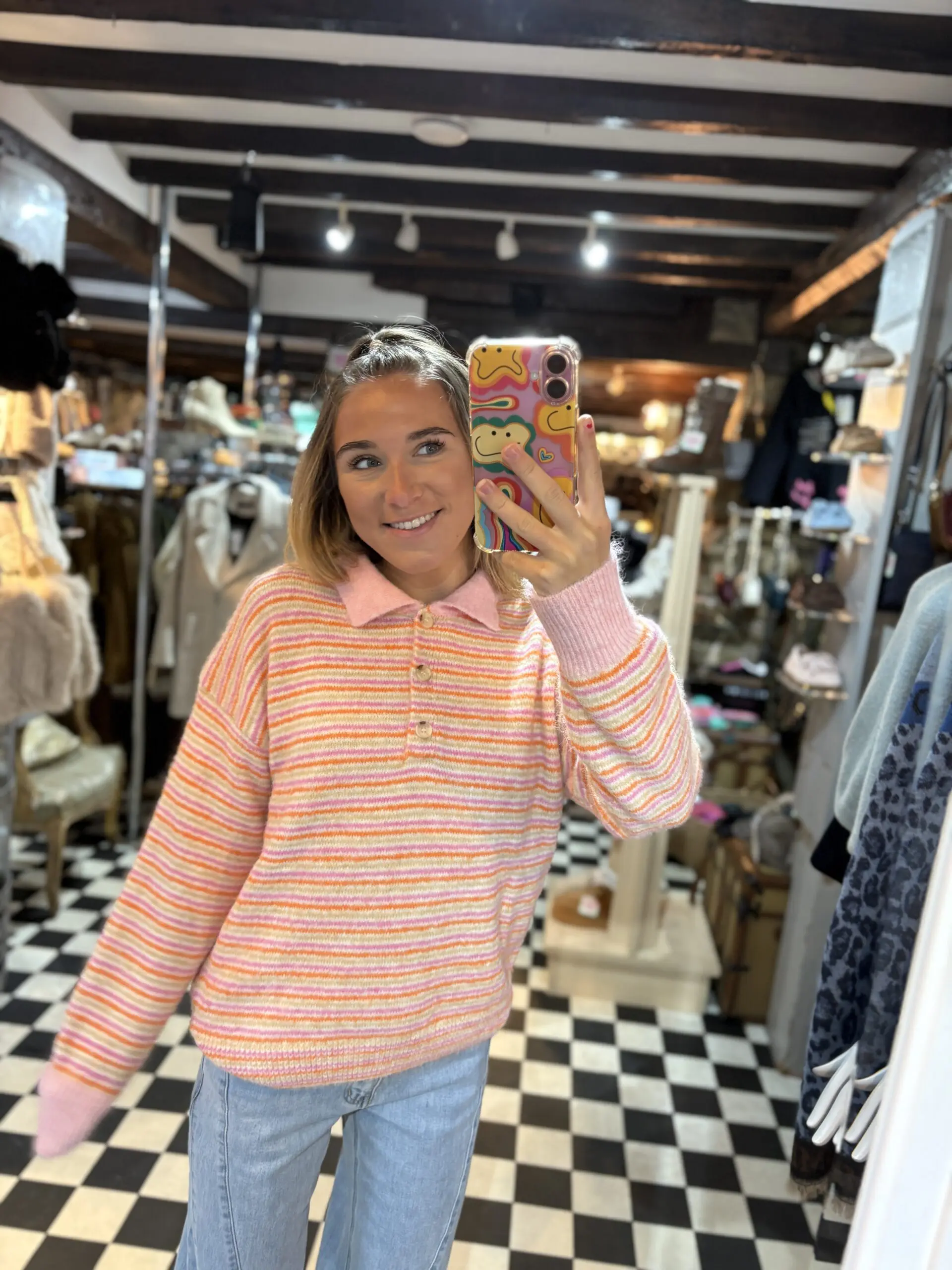 Beautiful new soft knit polo style jumper top perfect for the upcoming spring season. Lovely light pink, orange and beige colours.