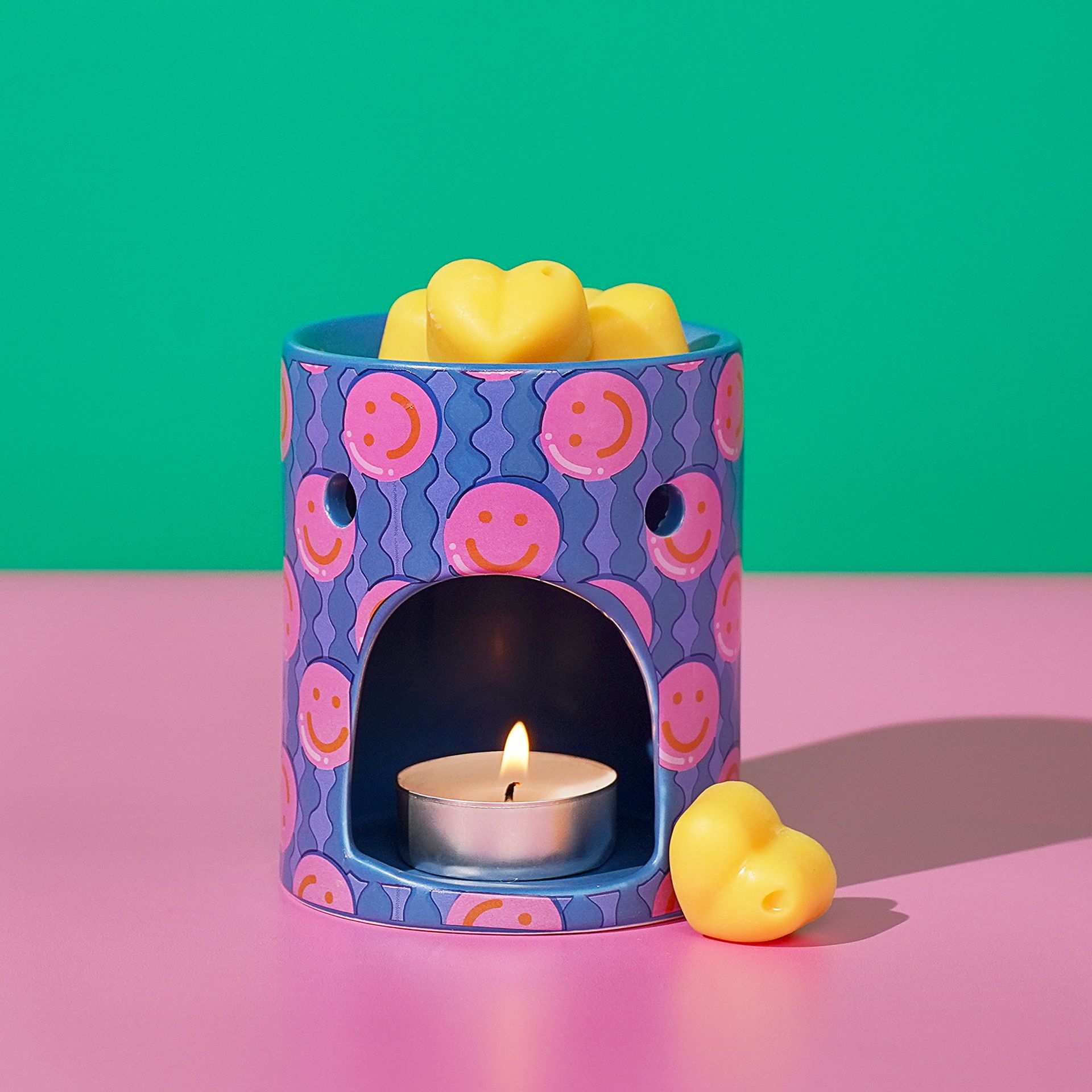 Inside the vibrant, retro vibe packaging are 4 x Mandarin, Yuzu and Grapefruit heart shaped wax melts that are ready to be burned in the equally cool ceramic burner which is covered in pink smiley faces. Such an great gift idea!