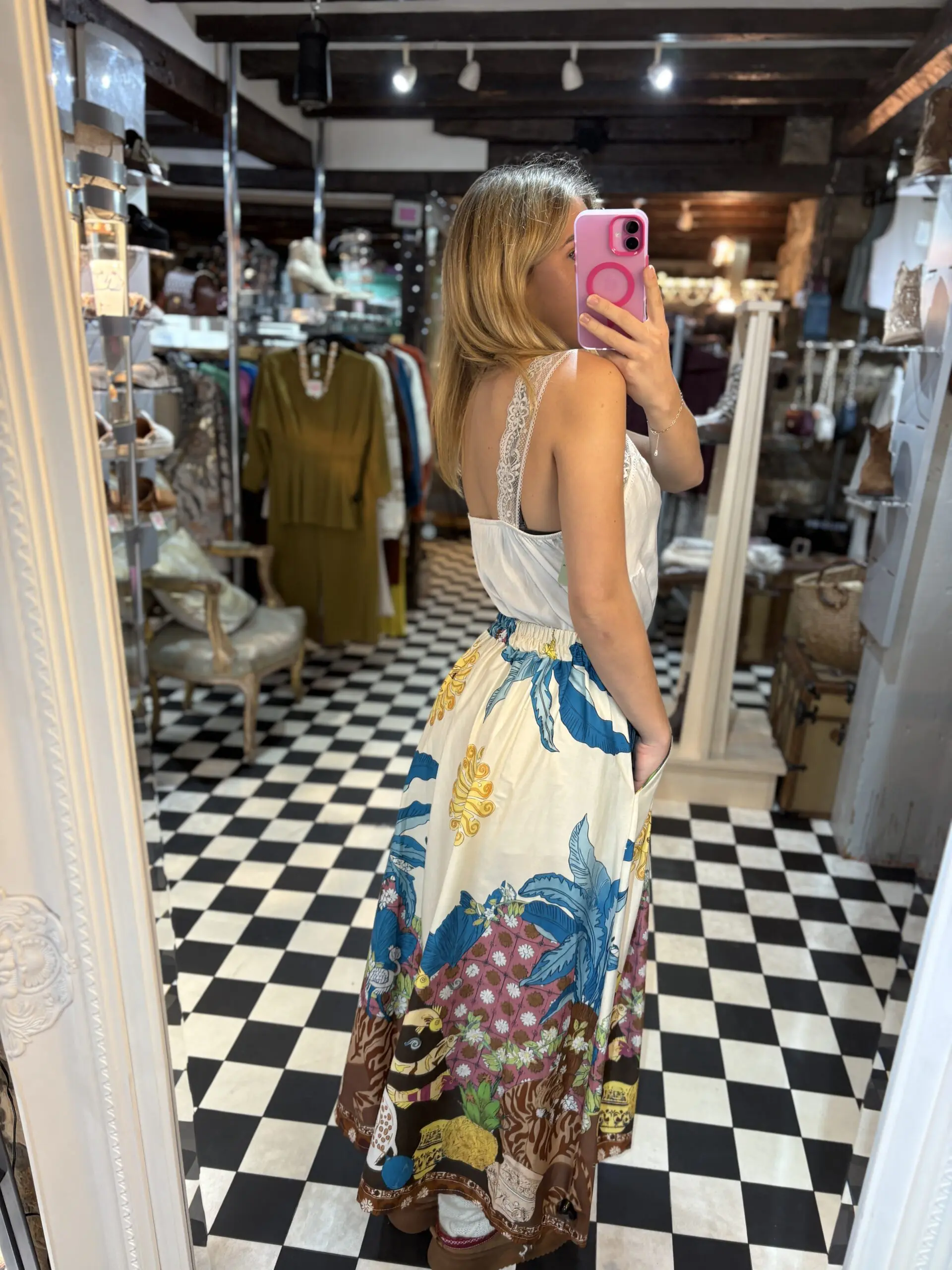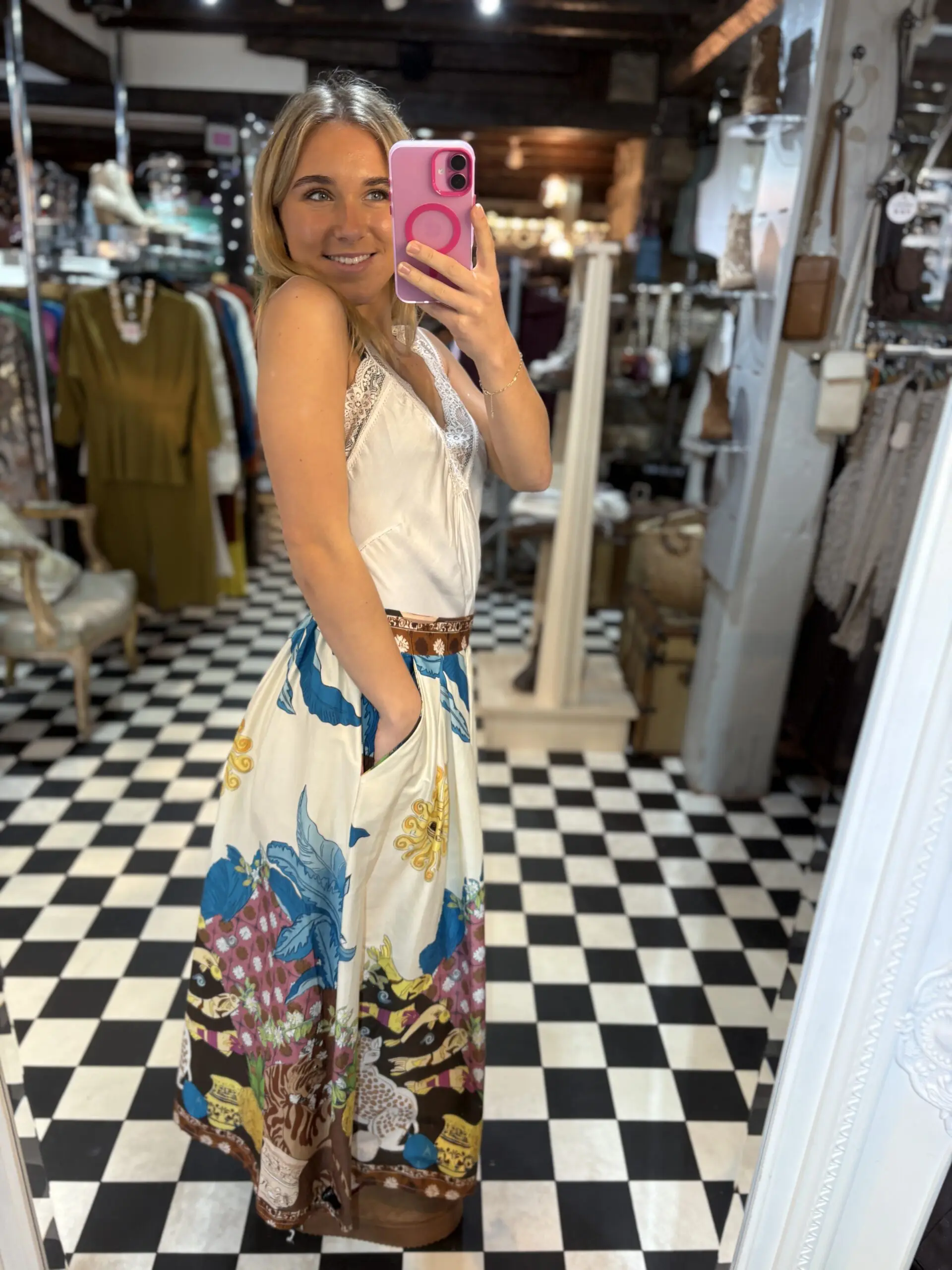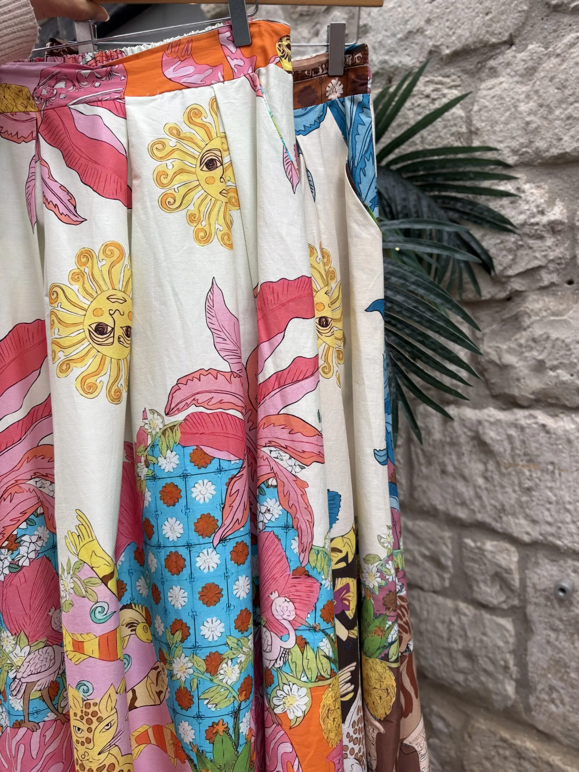 Lovely lightweight skirt with a wonderful sun and animal printed pattern all over it. Each skirt is slightly different and unique. Elastic at the back of the waist to ensure comfort when wearing.