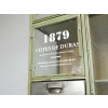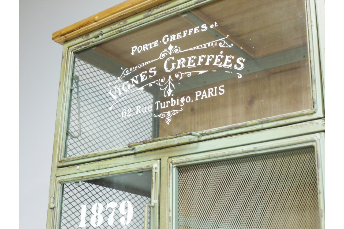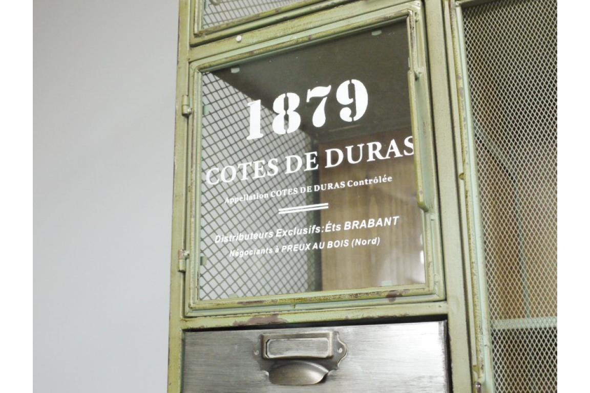It has French writing on glass with little metal drawers.