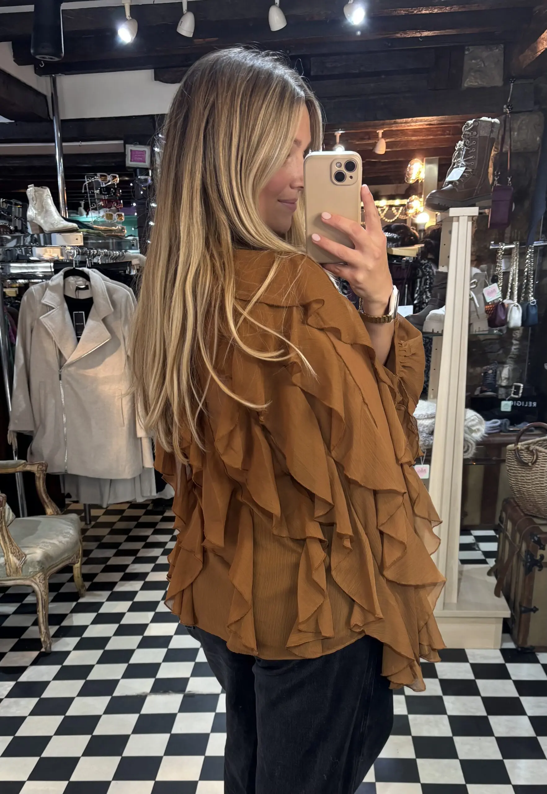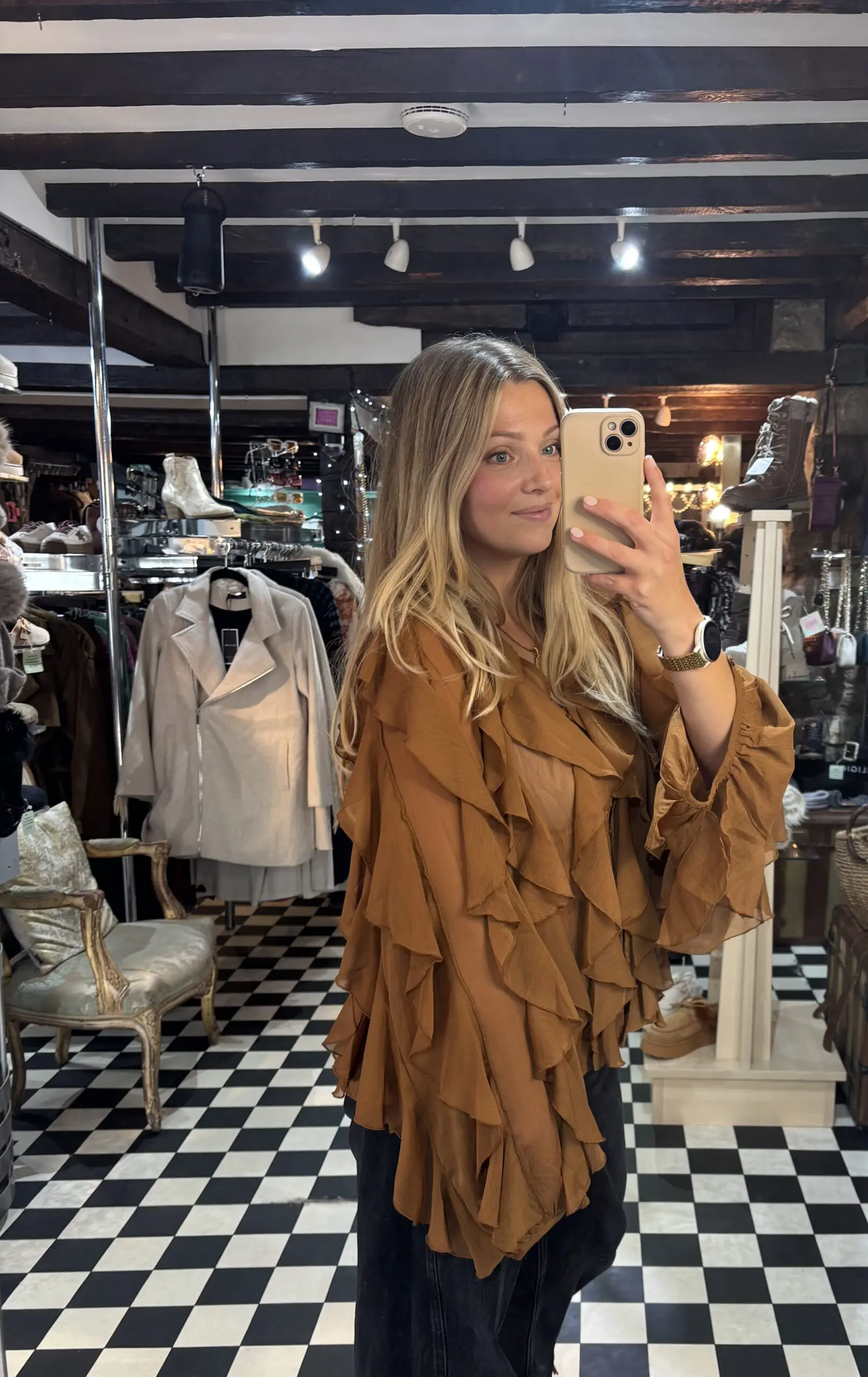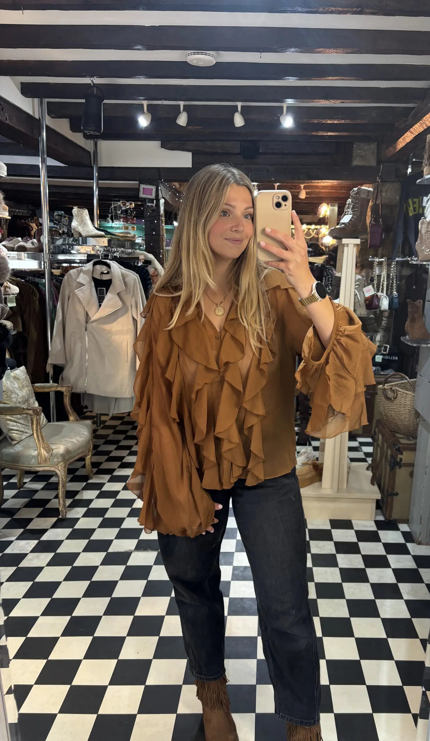 This is such a great top for autumn/winter styling.  Sheer with cascading ruffle style textures, it’s simple but effective.  V shape neckline with buttons at the front to fasten.