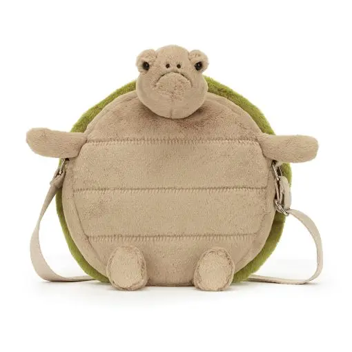 The Timmy Turtle Bag is charmingly grumpy, with a textured beige tum and embroidered green shell. The strong webbed strap will keep Timmy safe riding on a shoulder. With a silver zipper, Jellycat tag and protective beige satin lining, this bag holds everything but grudges!