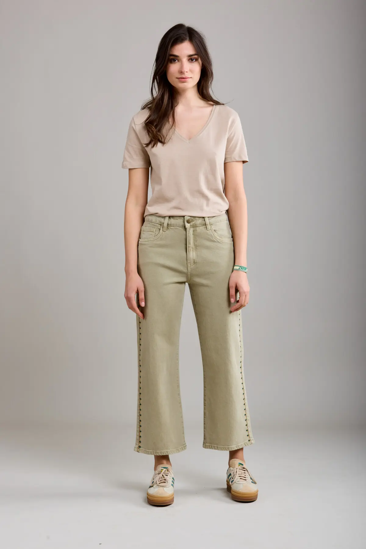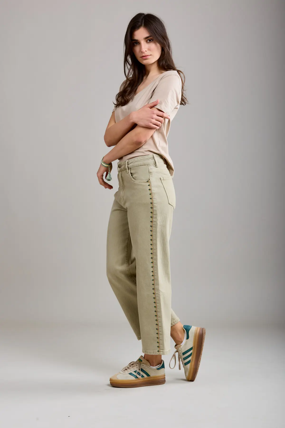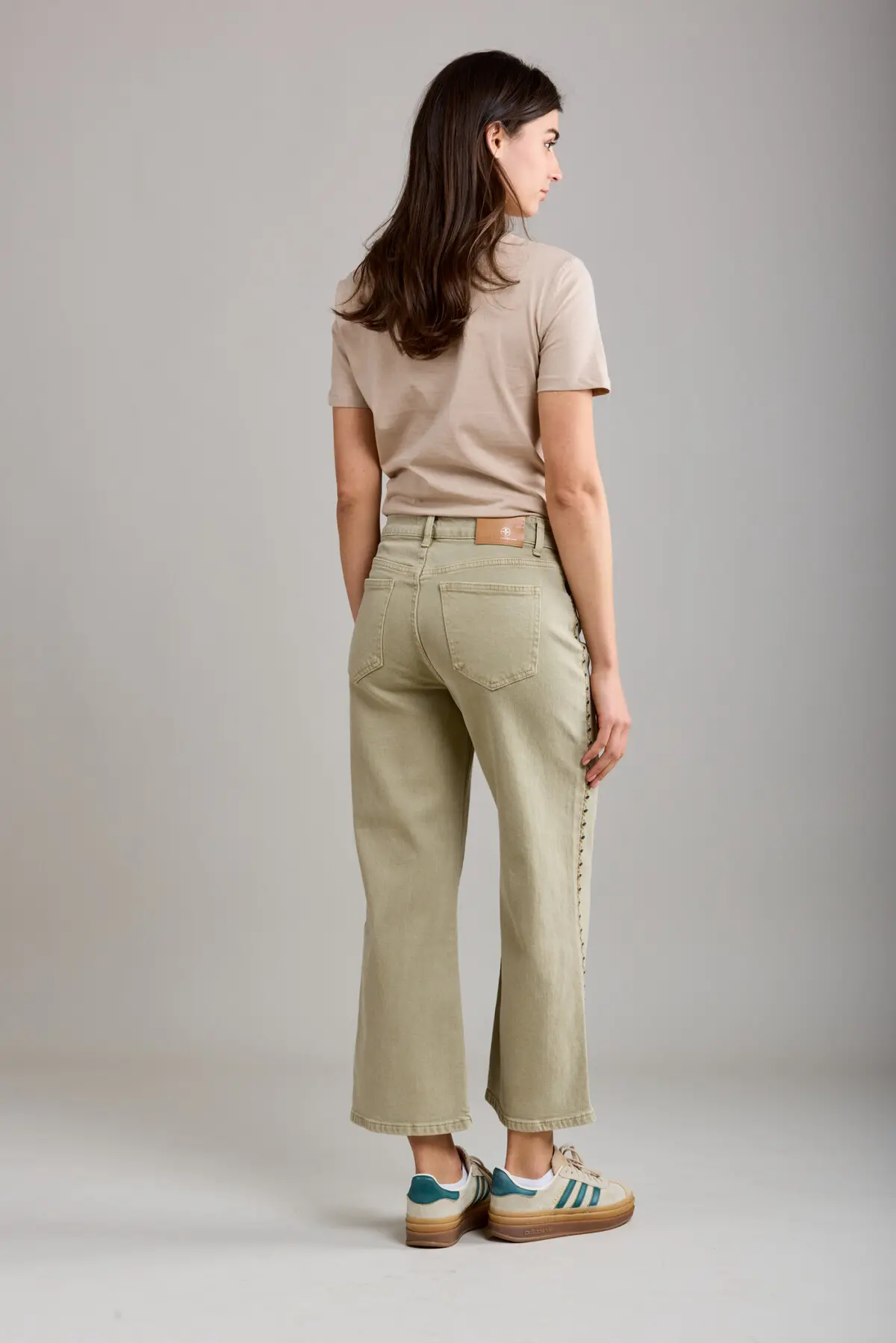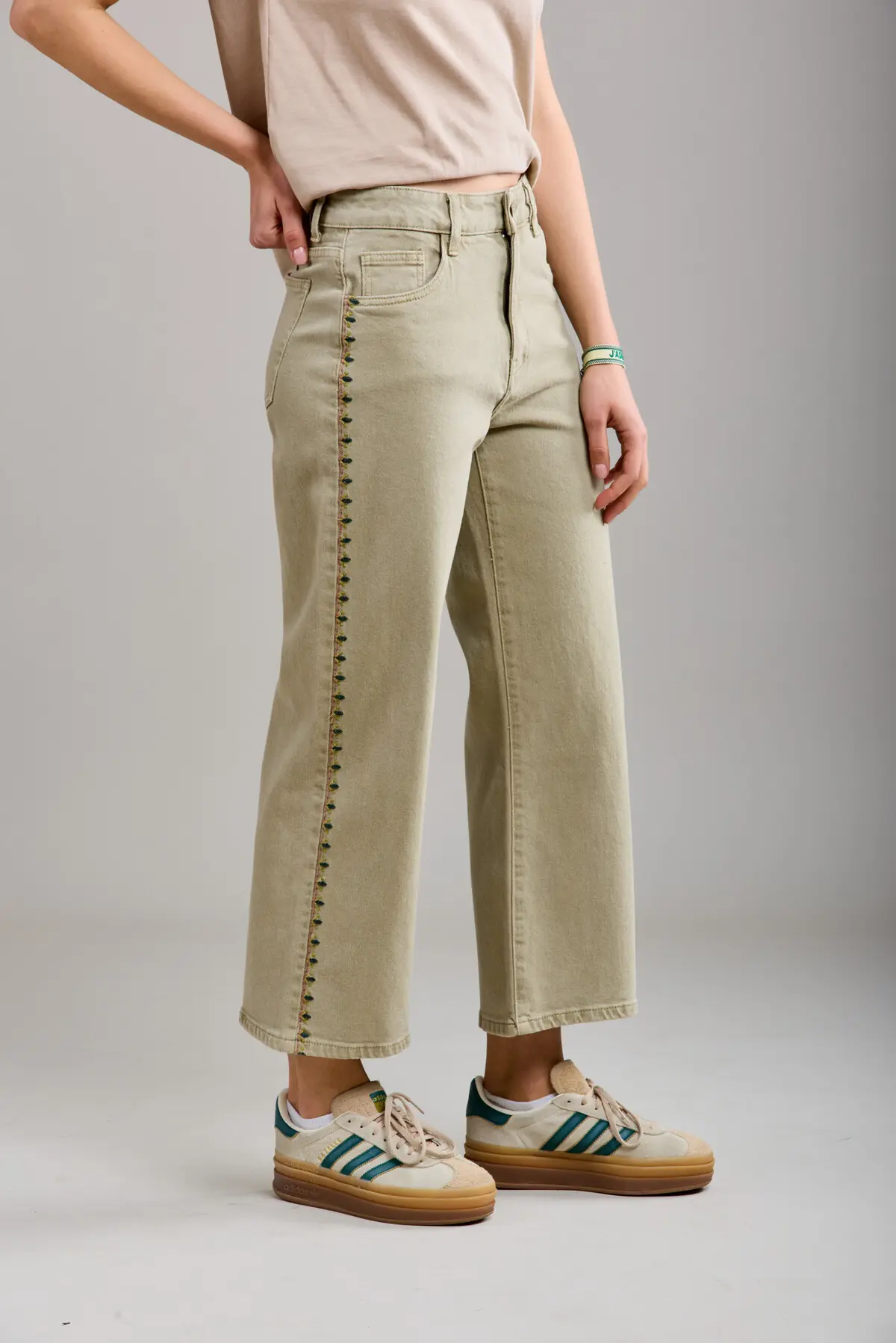 Beautiful embroidered jeans in a khaki colour. Comfortable and with some stretch. Cropped culottes style. Perfect for those summer days ahead.