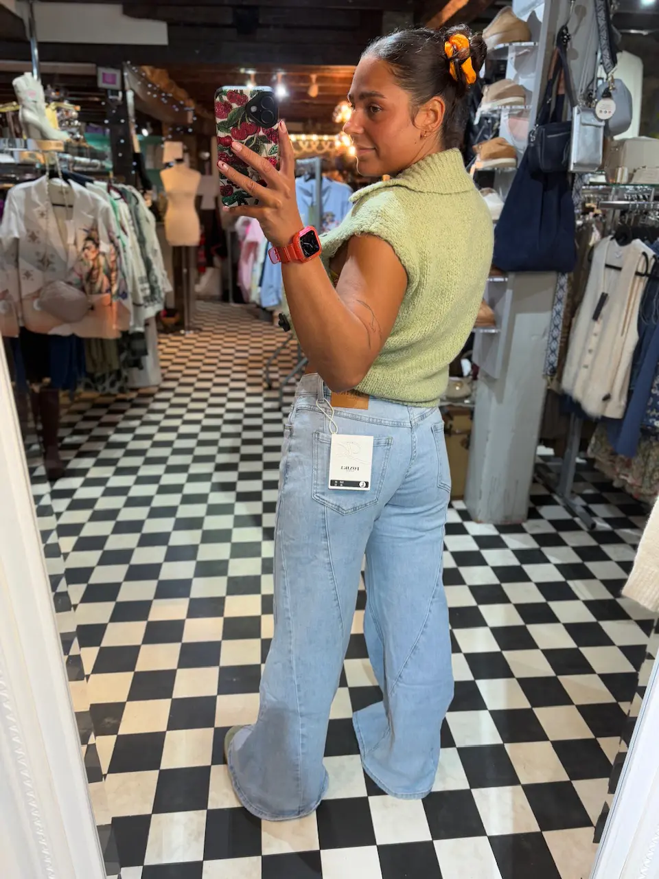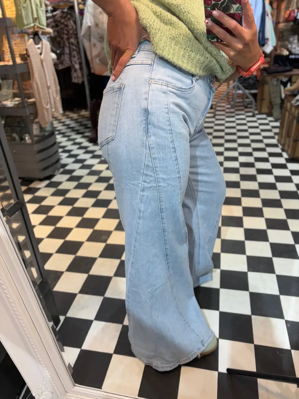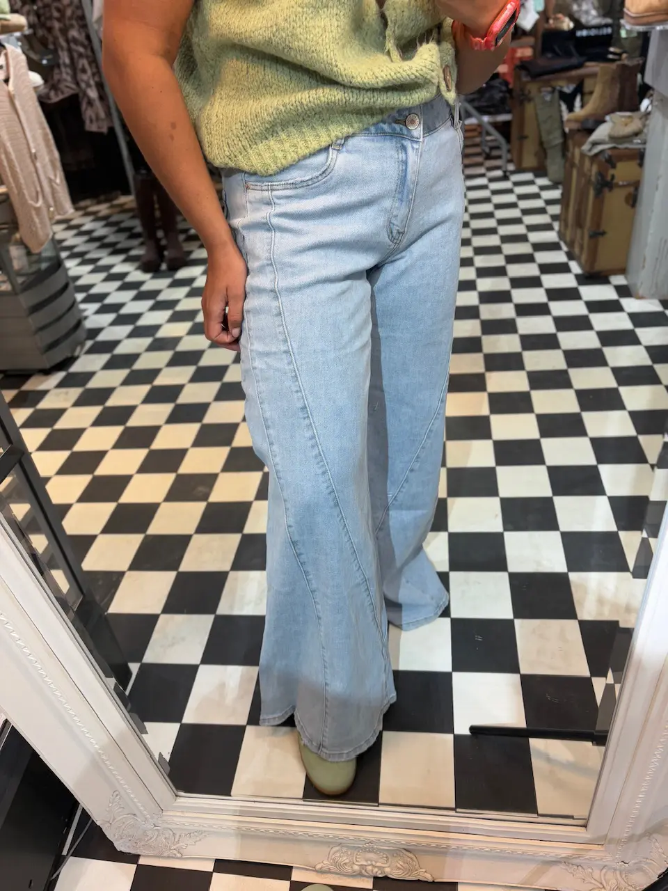 These jeans are so unique with their added detail on the side seam. Extra wide and flared fit / style. Comfortable and on trend, these jeans are quite generous with some stretch to it.