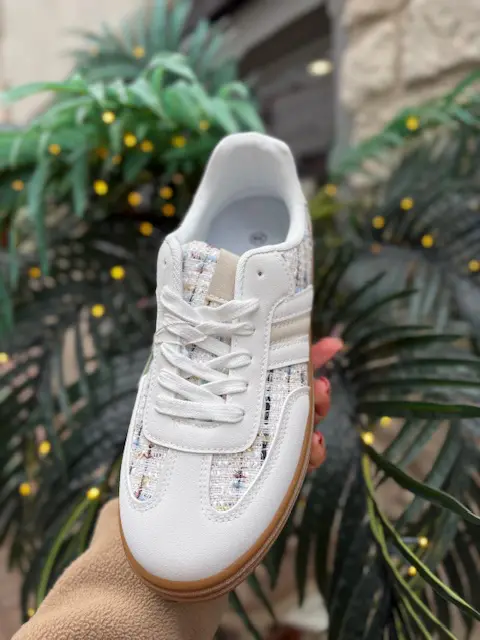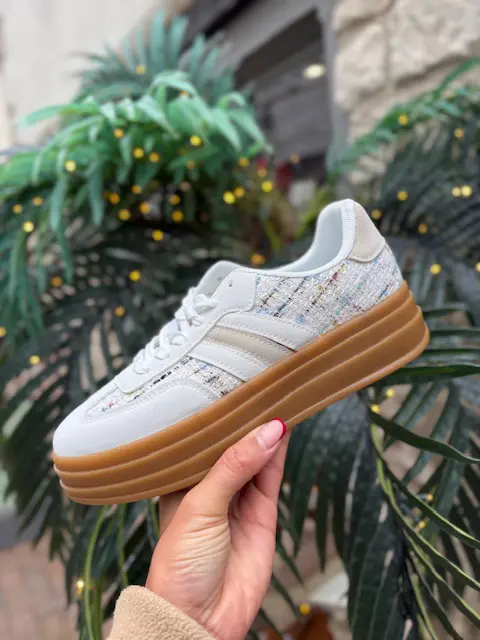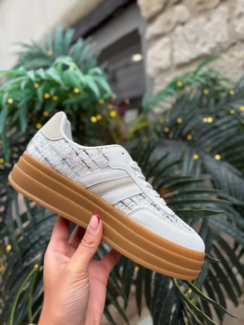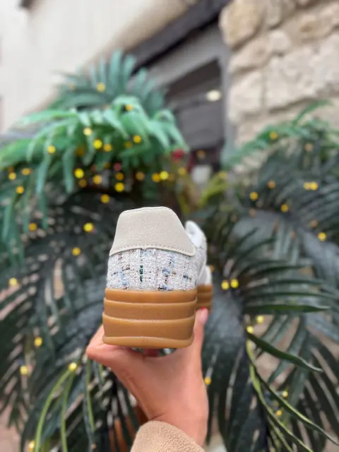 The trainer style we all know and love in our boutique now with a chic little tweed style twist. Elevate your look with these trainers. Platform gum sole for a little bit of extra height.