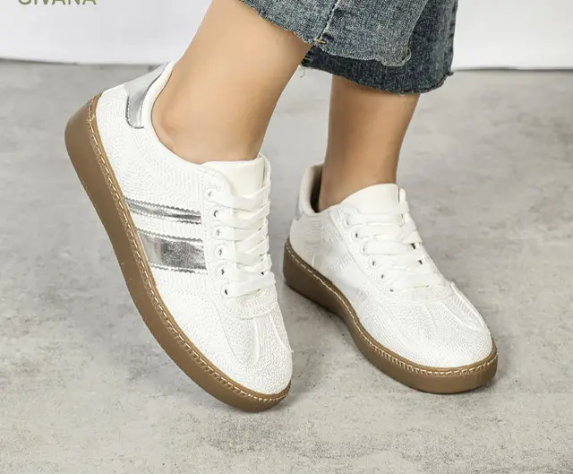 These trainers feature a gorgeous stitching pattern all over which gives them a unique and hard shell look. The pop of metallic is bang on trend for this season, along with its flat gum sole.