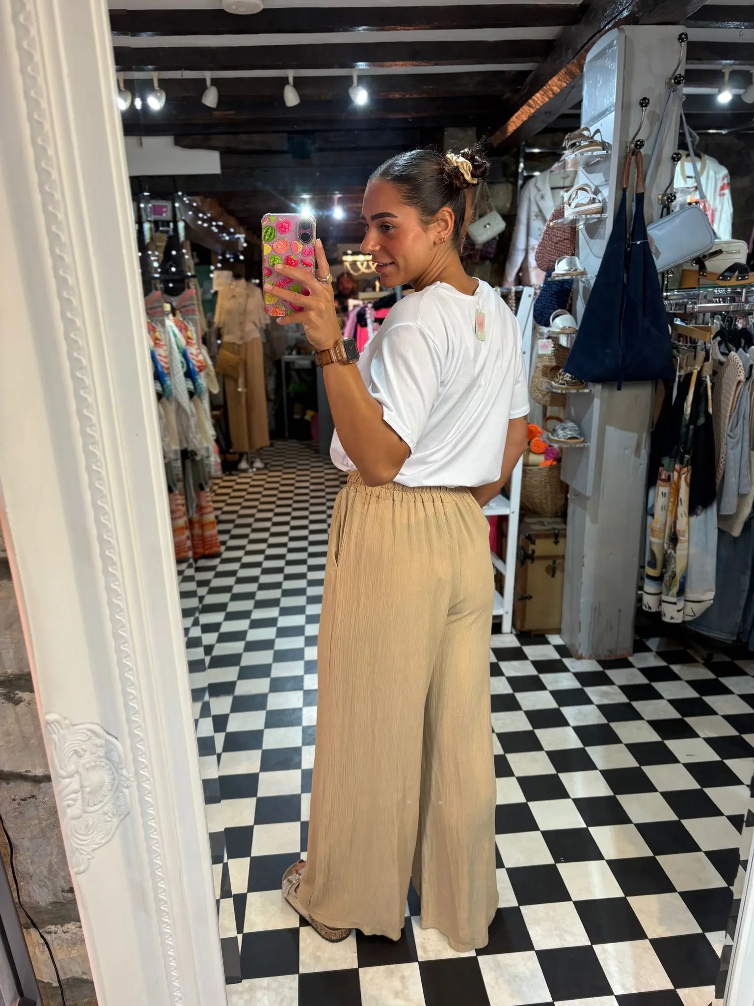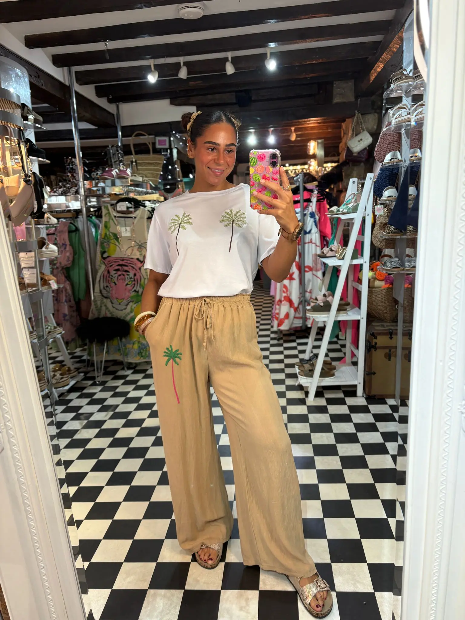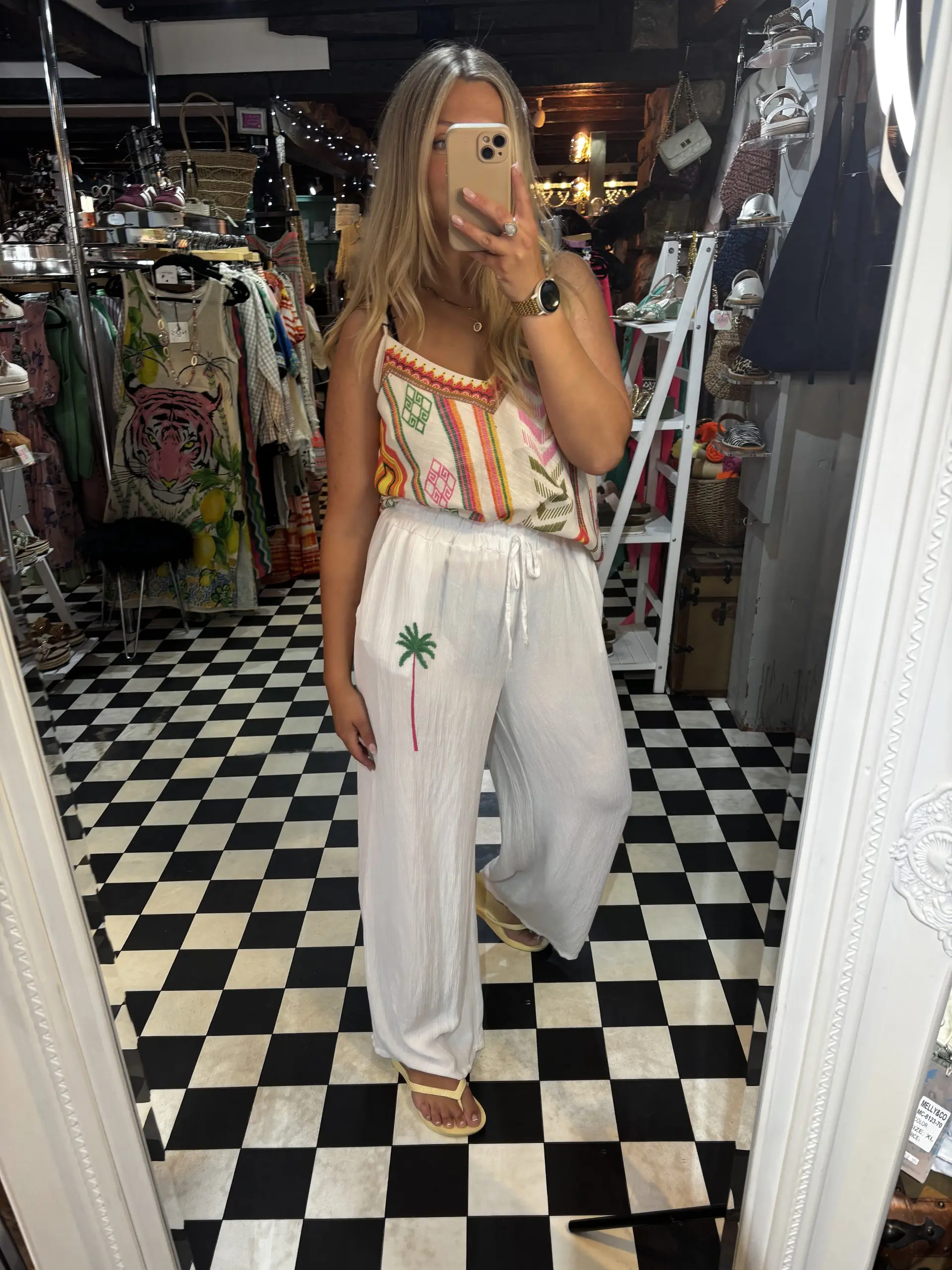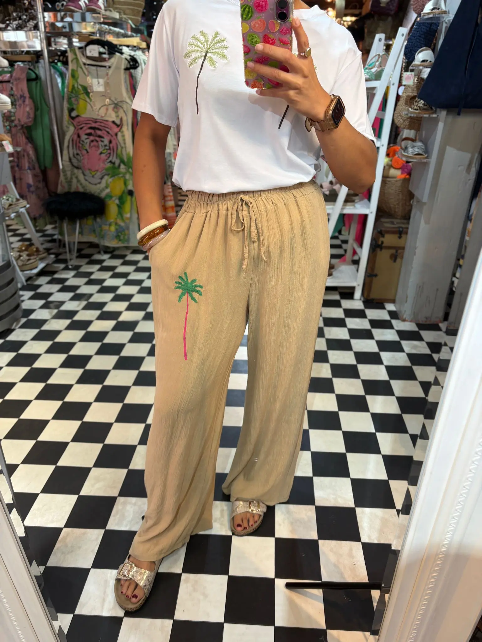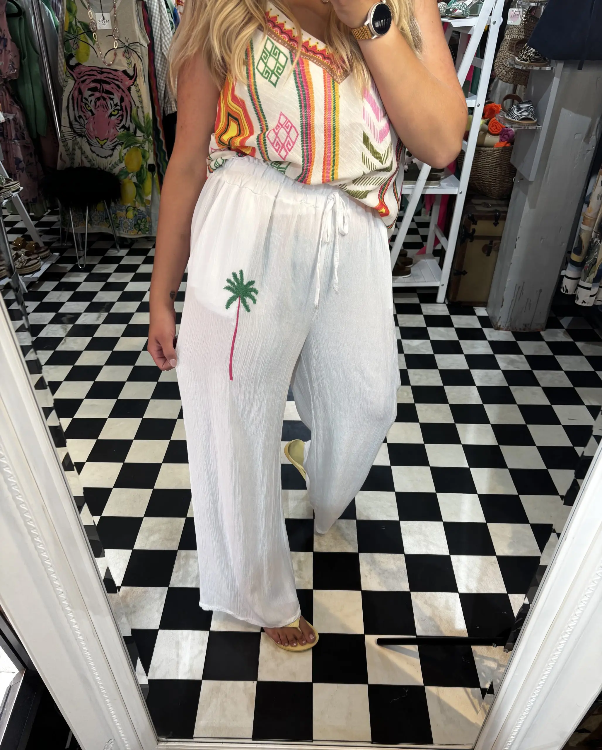 Gorgeous summer trousers with a pink and green embroided palm tree on the leg. One size fit.