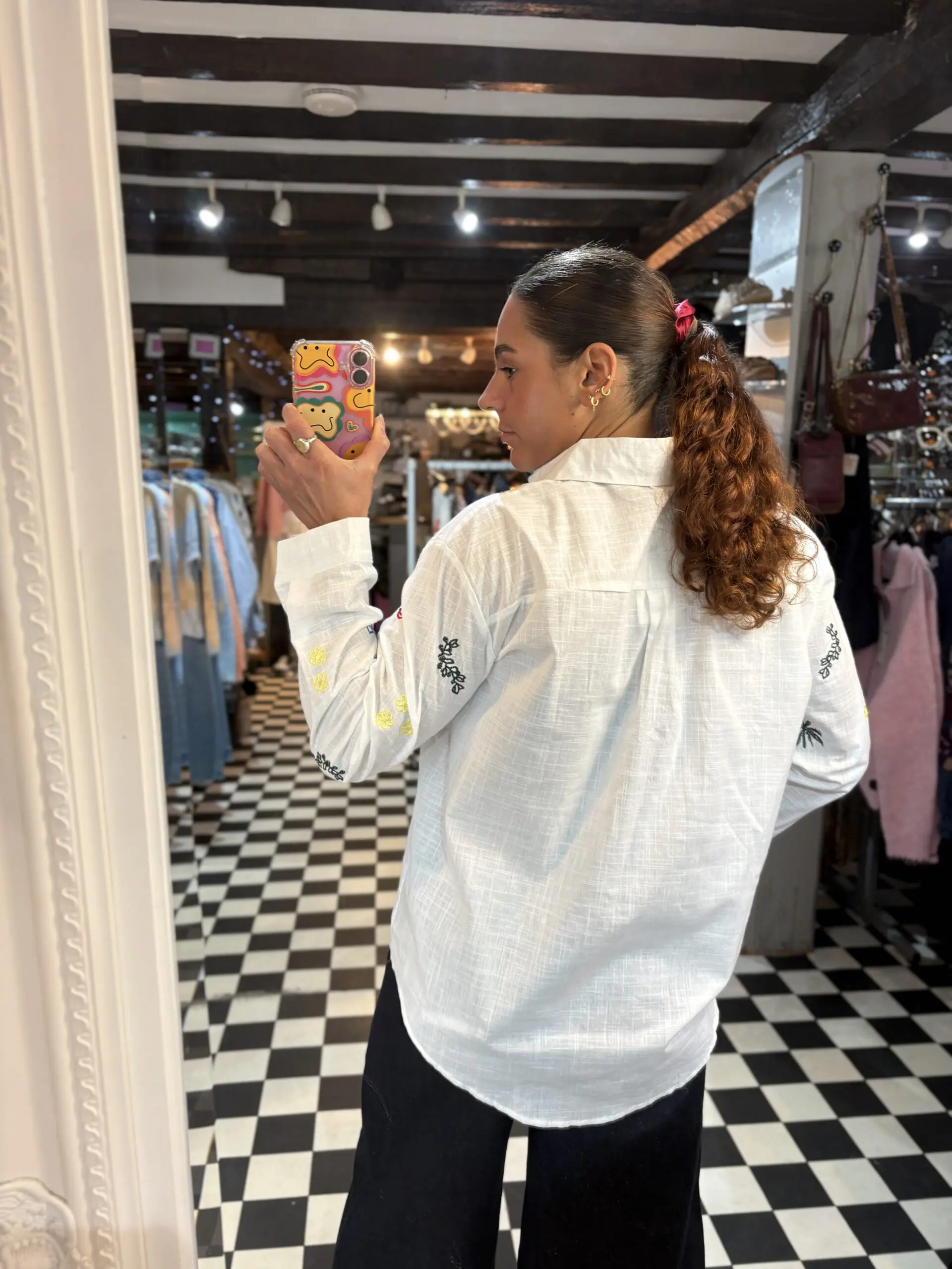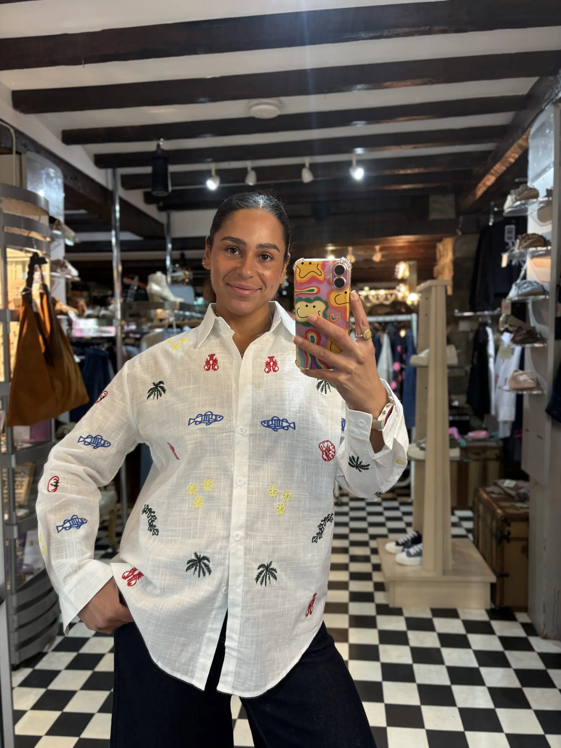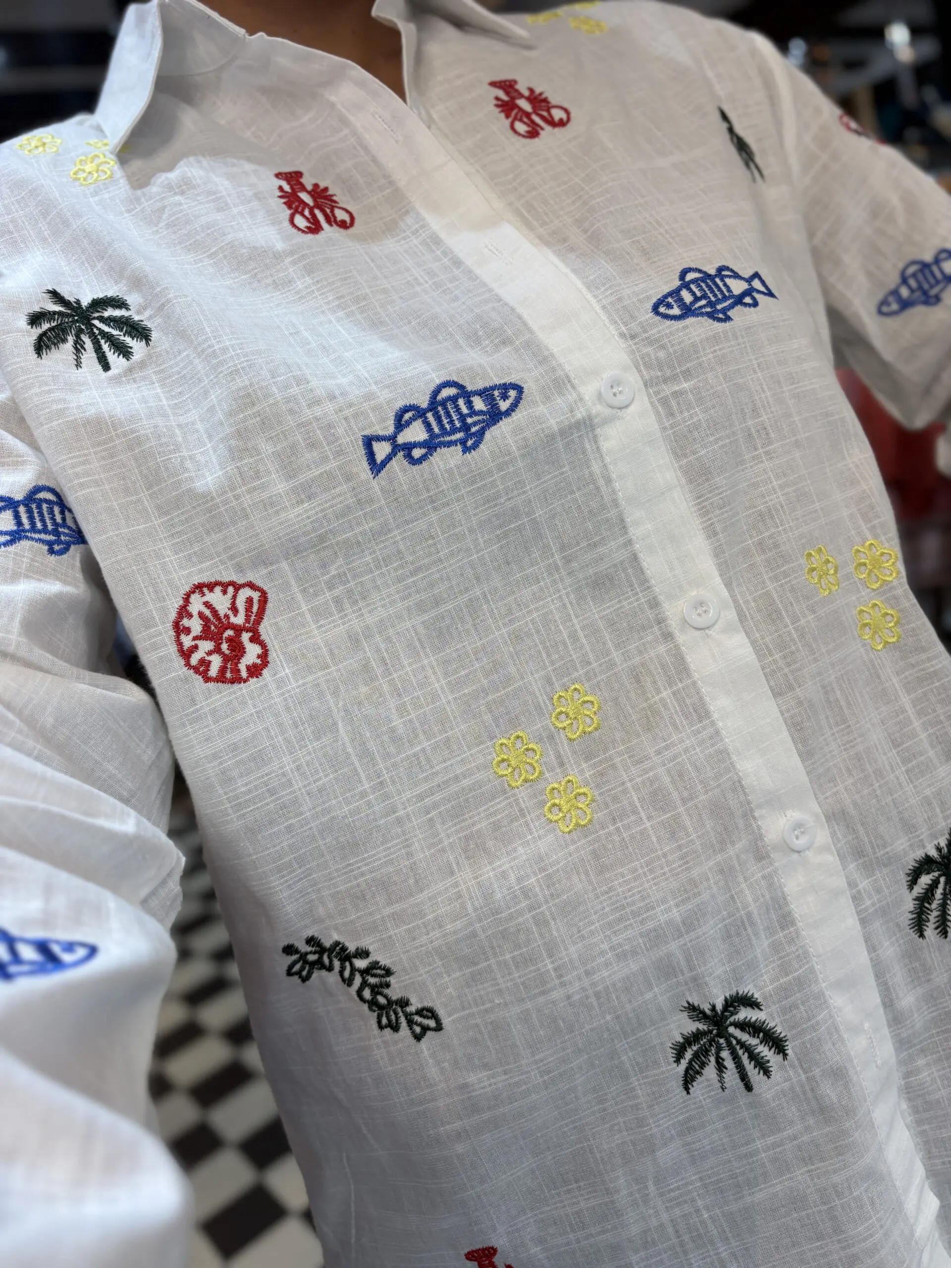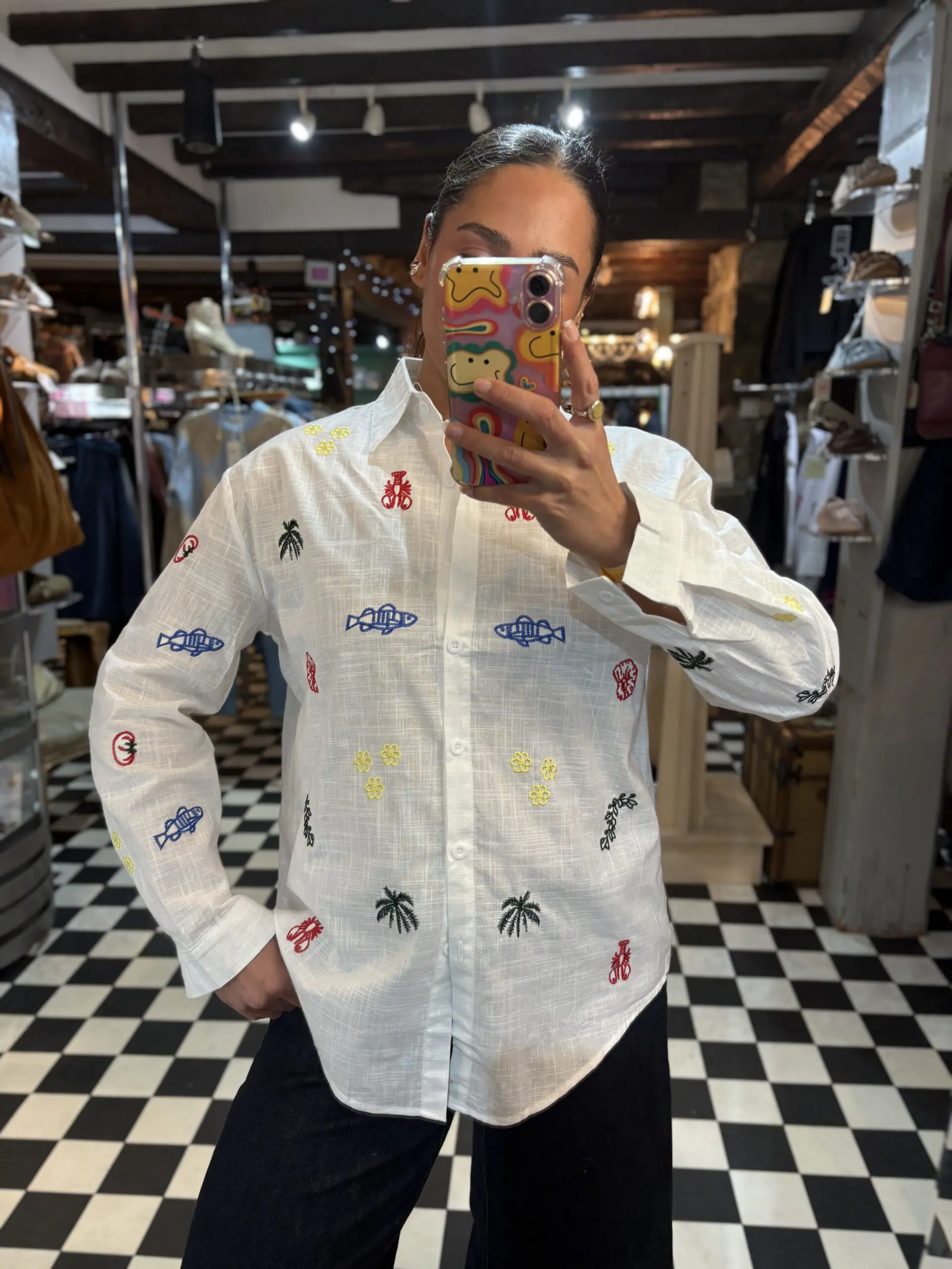 Lovely white cotton shirt easy to wear and breathable for the summer. Looks good on its own or worn open and layered. Oversize style. There is only size L in this shirt. Features lots of little summer theme embroidered symbols.