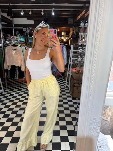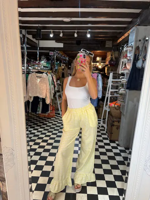 How cute are these yellow bell bottom style gingham trousers. Perfect for those sunny summer days. Can be dressed up or down. Feature pockets and a wide style leg.